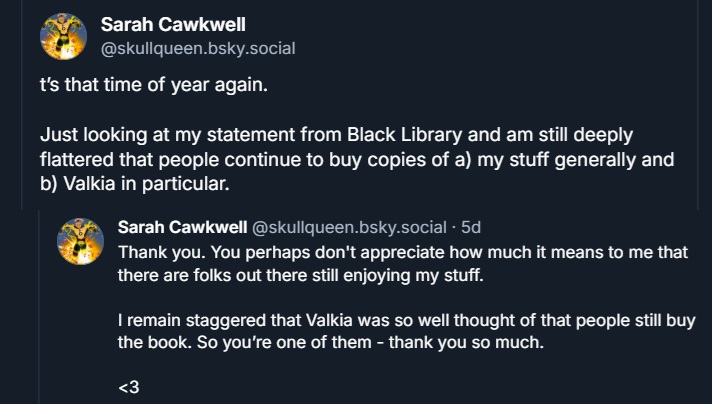 It's not often we get to see any aspect of the business side of being a Black Library author, but this past week it was "Royalty Day" for the writers. On this day the royalty checks go out based on sales performance for the past year, providing a residual income stream even for those no longer putting paper to pen for Warhammer.While most were unsurprisingly mum about it, a few did take to social media to share their thoughts. Josh Reynolds (Hammerhal, Khârn: Eater of Worlds) posted a full thread on BlueSky detailing his top-performing works:
