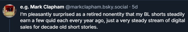 On the other hand, certain short stories sell consistently, if not well, and I have no idea why. "The Zheng Cipher", for instance. Sells a consistent amount every period. Why? It's a mystery.