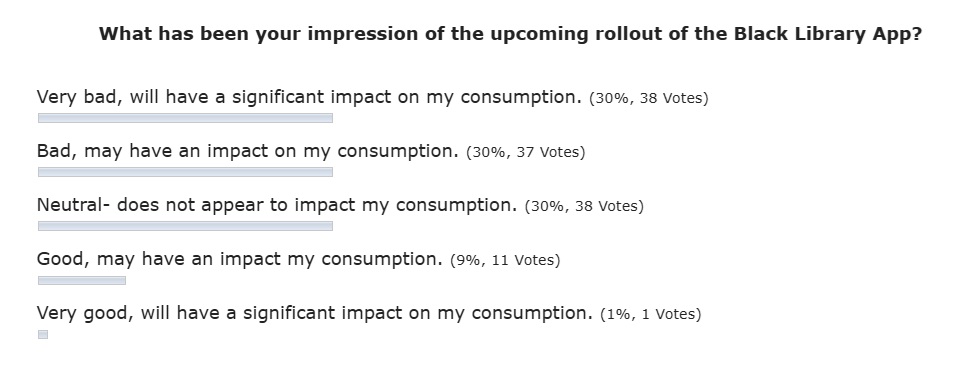 The big topic of discussion last week was the upcoming introduction of the Black Library App, which would replace both the Black Library Audio app as well as the BlackLibrary.com website.There appeared to be far more concern than enthusiasm in the usual forums, which perhaps unsurprisingly reflected in our unscientific, informal poll: