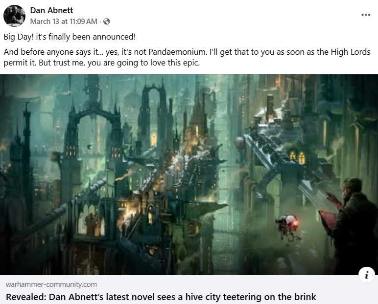 "Yes, it's not Pandemonium," noted Abnett on his Facebook page, and I have to admit that the announcement of the third book in the Bequin series was my dark-horse candidate for blockbuster announcement this Celebration.All the same, the reveal of a two-book series focusing on life in an Imperial hive is exactly the kind of vernacular literature I'm here for. For me this was a 10/10 reveal, no notes, stuck the landing, etc.