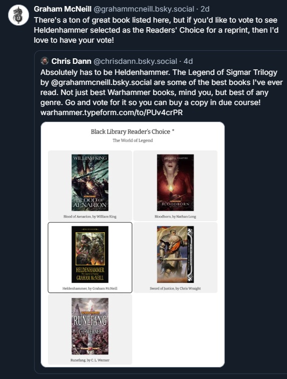 Just as in years past, the Black Library presented us with a list of books eligible for next year's Readers' Choice Reprints and asked us to vote for one in each category (40K, Fantasy).40K