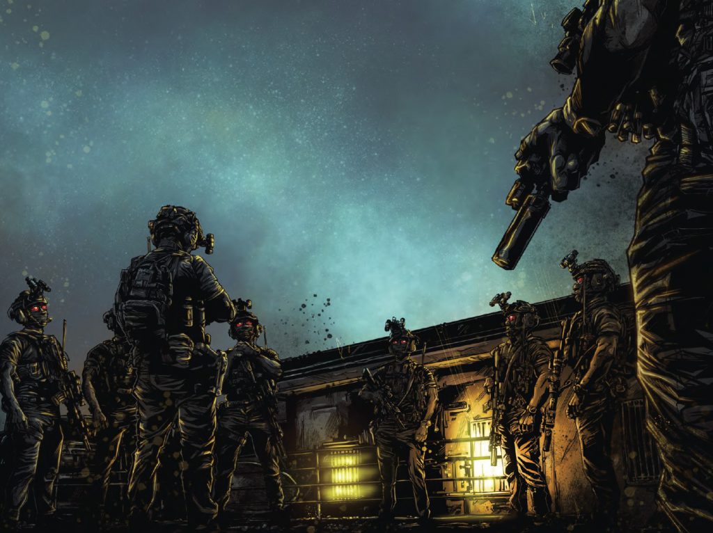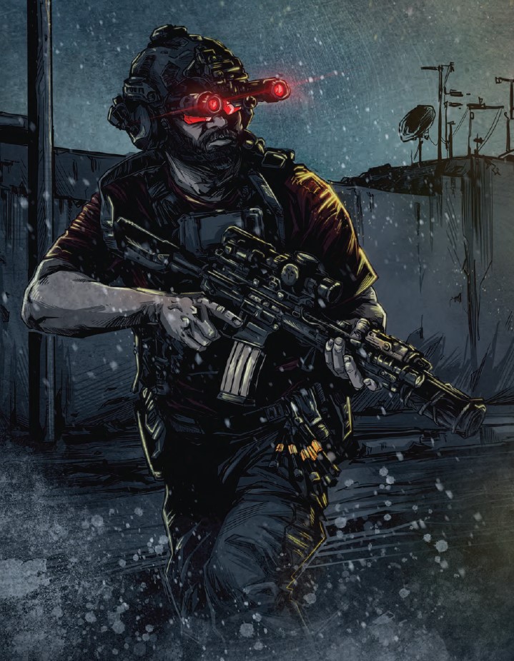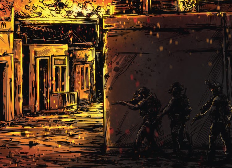 Black Powder Red Earth has been on my radar for a long time because it is a series of graphic novels, and I love comics. The writing is very focused on using milsim tactics and terms, even having a glossary in the back. The art by Josh Taylor deserves specific praise here - the full page spreads and sometimes double page spreads are amazing. I'm not an art critic but the figures are well proportioned and the effects used are realistic and evocative. Lighting is one of the key differentiators for this series, as the missions often take place at night so light sources can change the glow of everything.