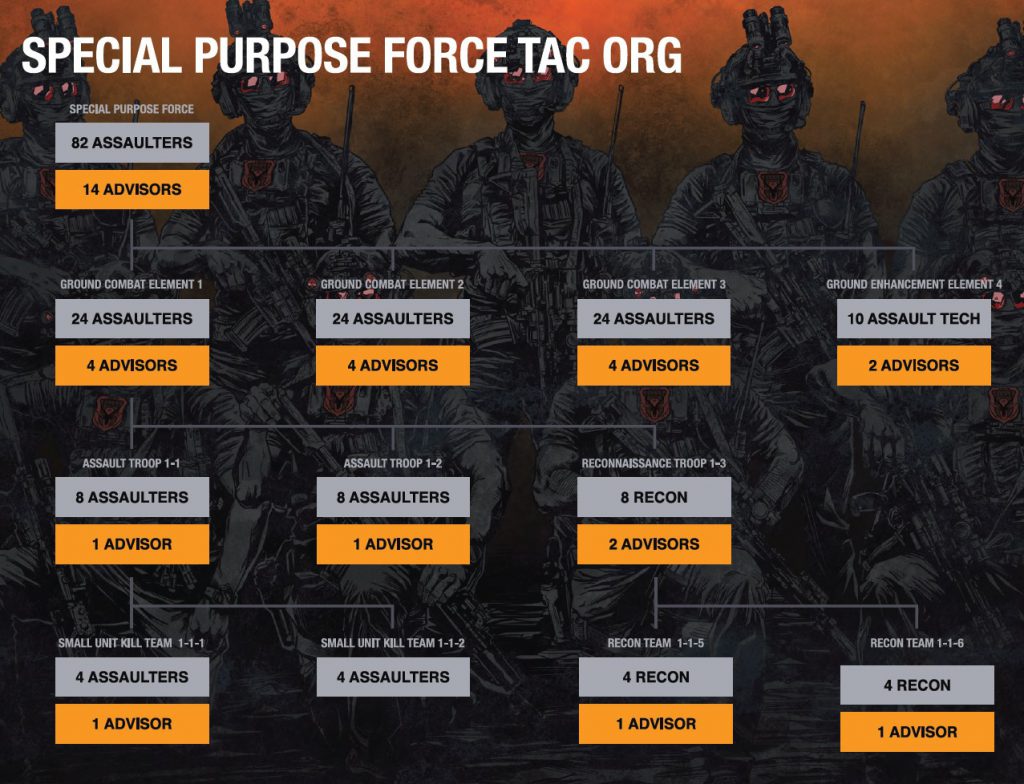 There are three operation teams at play here - Crisis Troop Scorch, the extrajudicial operations team that Cold Harbor has setup. They are made up of cells rom 4-28 shock troops, using carbines, machine guns, 40mm grenades, and drones to engage. They're heavily armored and prepared for night fighting as well. Crisis Troop Scorch is composed of:- Operation Advisor (the leader, can call in drones)