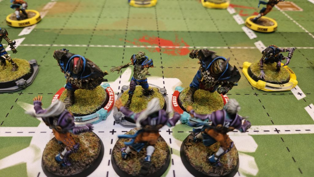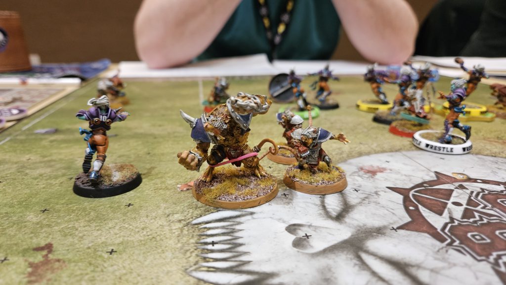 Honestly, not the best game of Blood Bowl. The play was fine, but my opponent didn’t seem to enjoy himself and his pace of play was rather deliberate. Who knows, maybe it was me. Anyways, a tie isn’t the worst thing to happen in the 1st round of a Blood Bowl tournament, as it means I probably won’t get fed to a buzzsaw in round 2. We break for lunch (I got a salad), and we’re back for round 2!Game 2: Baja Blasters vs Skink Bomb (Lizardmen)