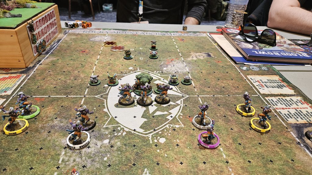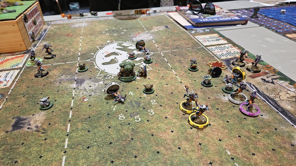 It’s nice weather, and I’m receiving in the 1st half again, which is great because I’m honestly in danger of being board-wiped. Right before we start, Tim hits me with the old duplicate ball trick play and on top of all the violence I’m about to be party to, now I have to worry about scoring with a fake ball! I manage to get both balls to my catchers and away we go! My plan is simple: get both catchers into scoring range quickly and safely and score as soon as possible to mitigate the danger of scoring with the fake ball. My plan works swimmingly! I get my goons into position and score on turn 3, on the 1st attempt. I kick to Tim, and the bloodbath begins.