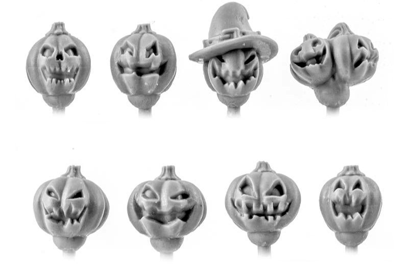 Now that we’ve got our roster sorted, let’s take a look at the team itself. I’m one of those people that hates to do a project unless there’s some fun thematic spin on it. I don’t think I’ve ever bought a GW Blood Bowl team and just built and painted it, which has stopped me from taking up teams I’d otherwise be interested in, just because I can’t think of something stupid to do with them. Anyway, while browsing the excellent bits site Anvil Industry, I came across these spectacular Jack-O-Lantern heads.