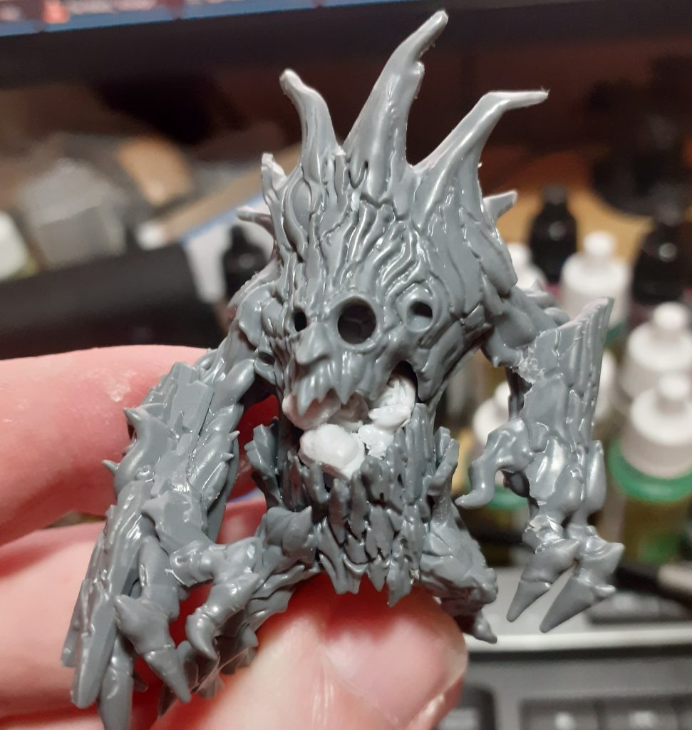 Rumblelow and Akhorne. Credit: HardyRoachThe Treemen are getting painted in two pieces, with the face separate so I can paint the hollow interior. Everything received a zenithal priming with the airbrush (Black > Vallejo French Mirage Blue > Vallejo Pale Sand > drybrush white > lowlight with nuln oil).