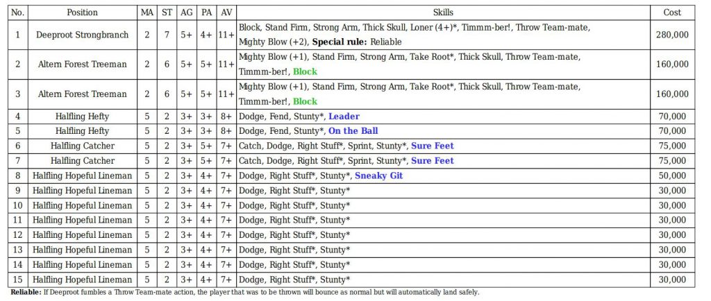 The rulespack for the Backbreaker puts Halflings firmly in Tier 3 (of 3), which means I’ll have the usual 1150k gold to spend, plus 5 primary skills, 2 secondary skills, and space for a single star. With that in mind, here’s my roster: