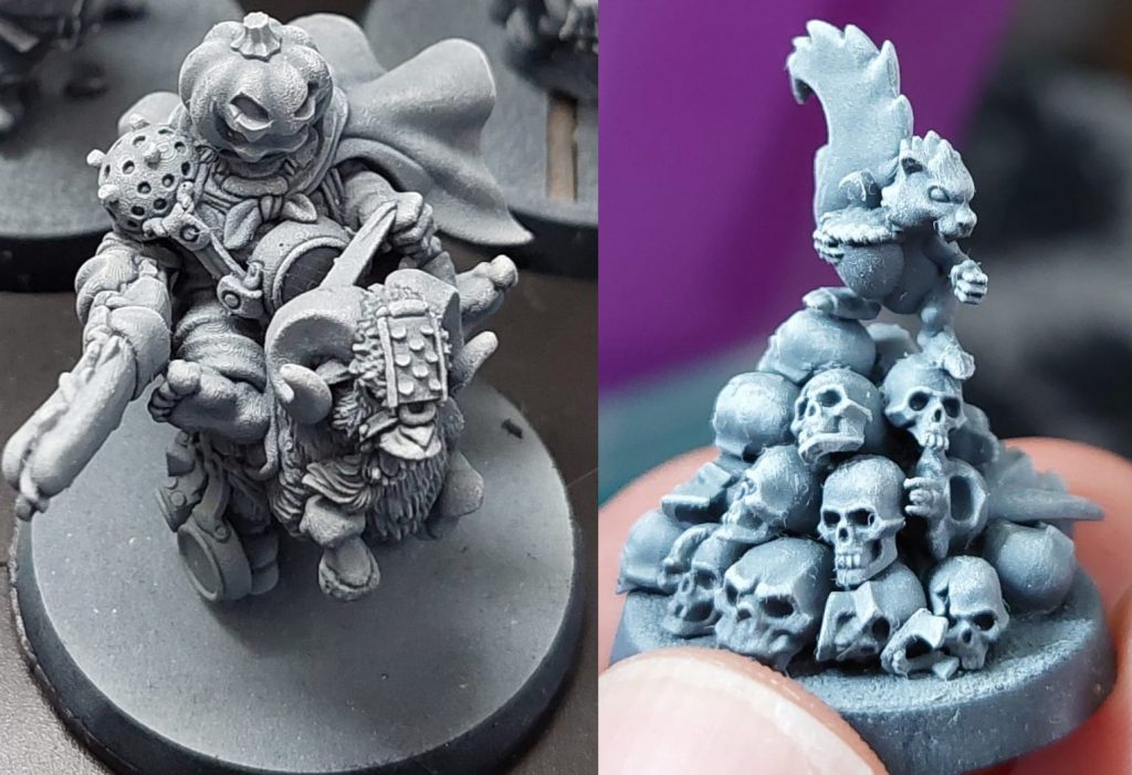 The Pumpkin Patch Crew, unpainted. Credit: HardyRoachThe GW Halfling team are among my favourite sculpts from the company, so I didn’t want to change too much. Just a simple head-swap would do nicely. Bar needing to fill in some neck gaps with green stuff, it went off without a hitch. The Hefties have the larger hollow pumpkin heads, one of which is filled with candles, the other with delicious pumpkin pie (yum, even a spoon so you can dig in right away).
