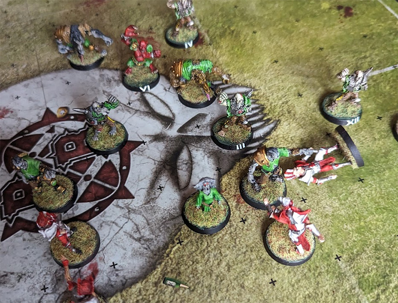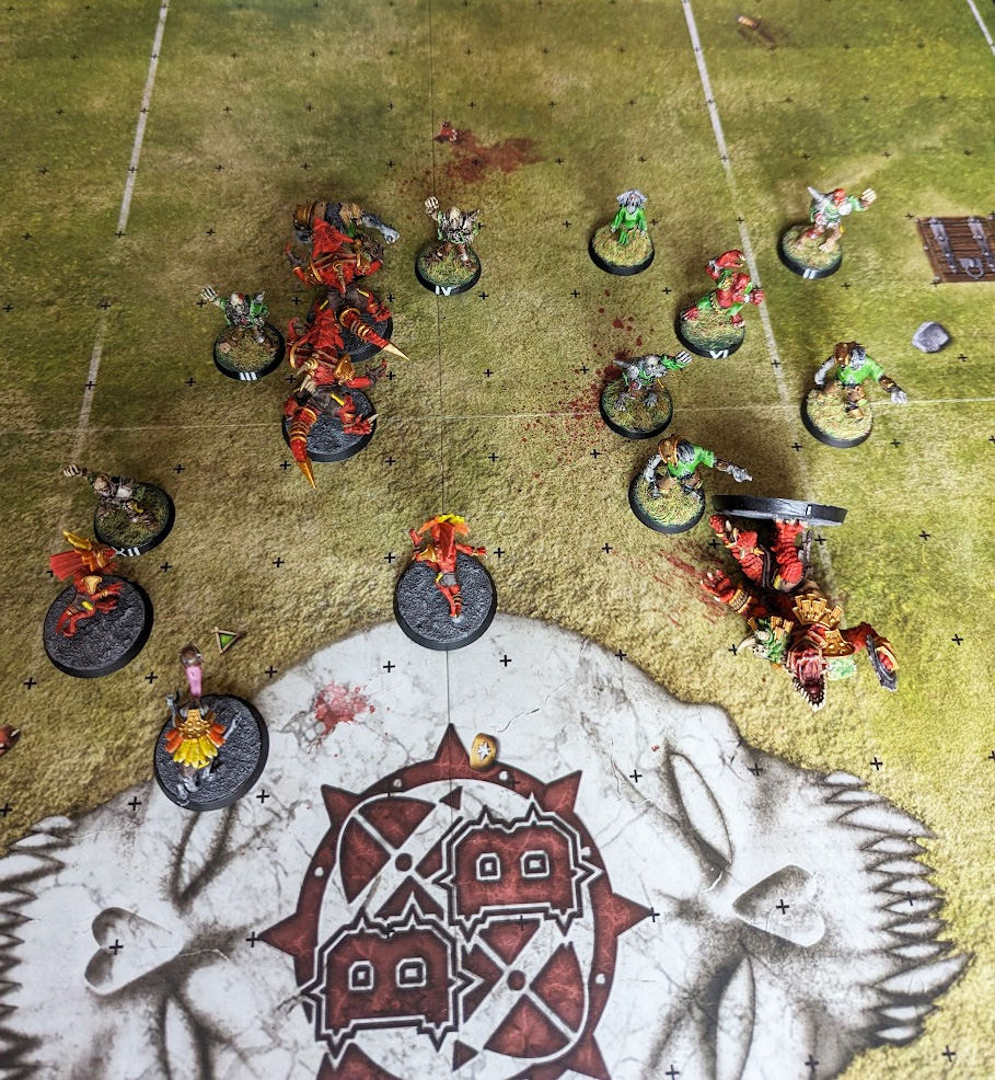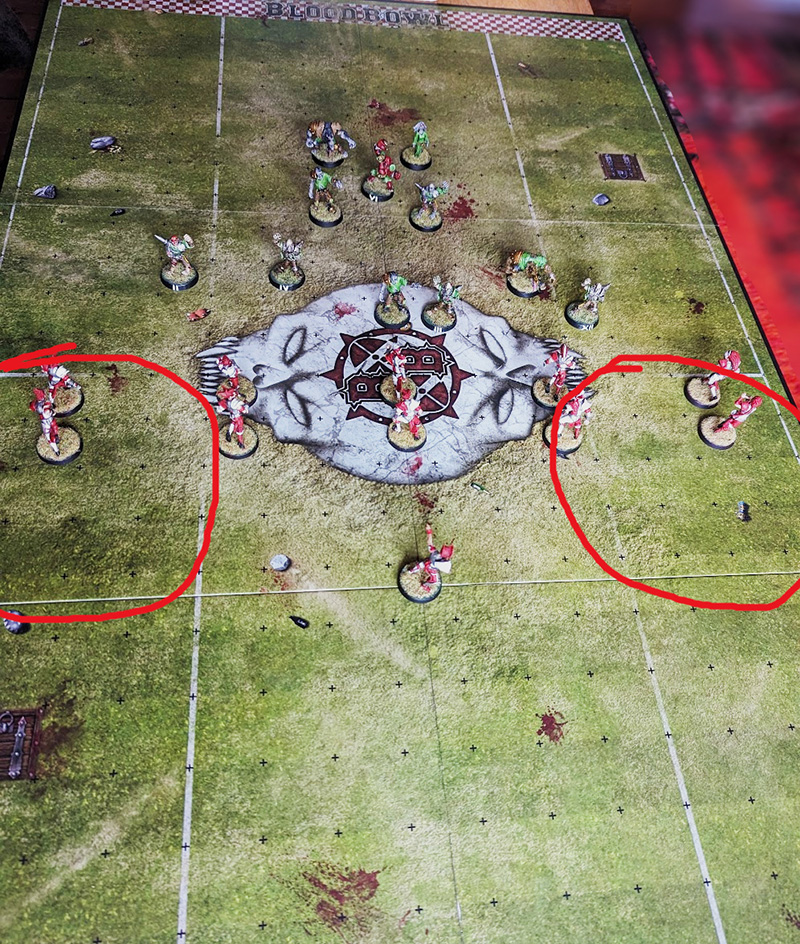 The Elves have aggressively based almost the entire Necro team, who have little choice but to make as many 2D blocks as possible to relieve the pressure.A persistent opponent who bases up and stubbornly refuses to get killed can bog your drive down into a huge melee that denies you progress down the field and burns clock. But theoretically at least, giving you free blocks on their players is not a viable approach, and if your opponent leans into this tactic early, you should not be afraid to let a little clock burn while you simply block their players away and hope for removals. As the drive progresses, you will need to keep a closer eye on the clock and lean more into moving away from basers. At this point you may need to lean into some of the tactics below.