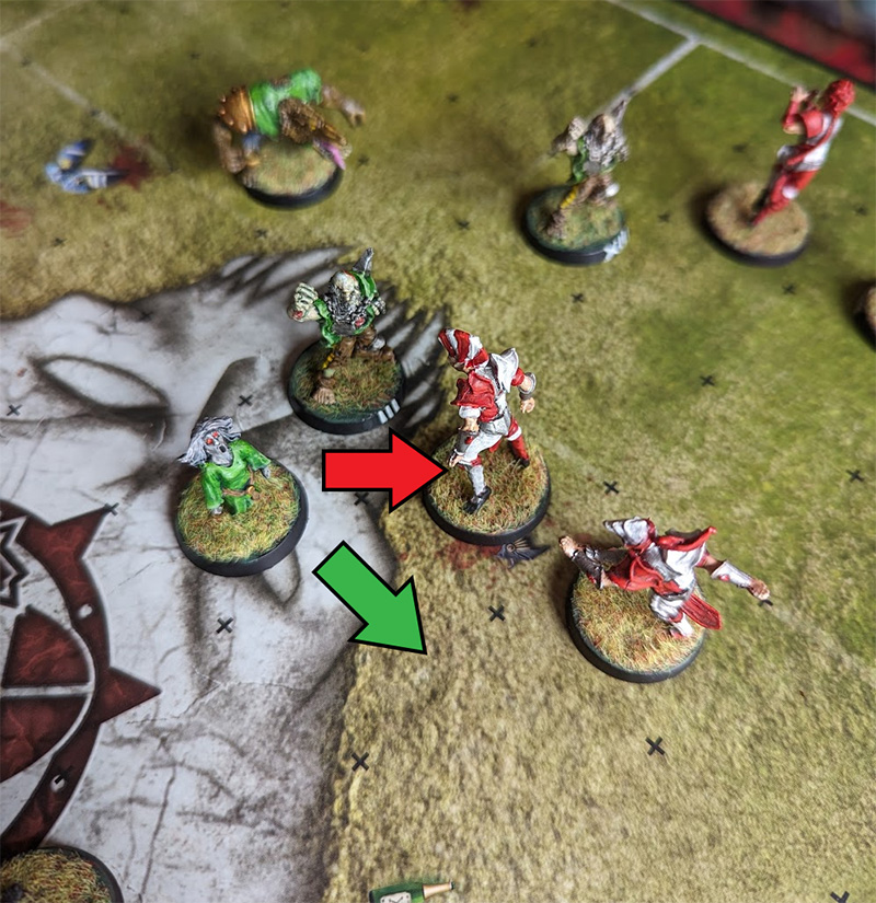 The Orcs have broken the cage and marked the Chaos Renegade ball-carrier, but if the Minotaur Blitzes as shown, any pushback creates a chainpush that can either move the other Orc away or move the ball-carrier to a safer spotUltimately, a time may come when you have to bite the bullet and dodge away. For most teams that will be a 3+ roll, and if you have a Team Re-Roll handy that’s a roughly 88% chance of success. So don’t be afraid to take the option when things look dire.