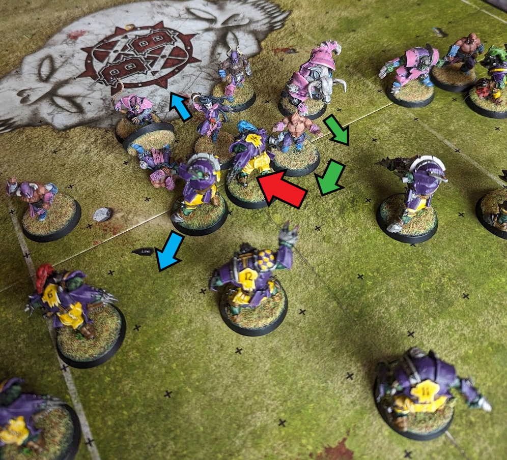 The Orc Big'Un wall is one of the hardest to break down, but the Dwarves only need one 1D push or knockdown on the edge to set up multiple further favourable blocksSticking to the middle of the field for as long as possible will be even more advantageous in this scenario, as stronger opponents tend to be less mobile, and thus marking the width of the pitch and having a strong blocking wall will be difficult for them. You can act out the contest of strength in the middle of the field and make a decision based on how that is going as to whether you want to make a dive for the sideline later in your drive.
