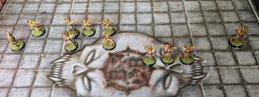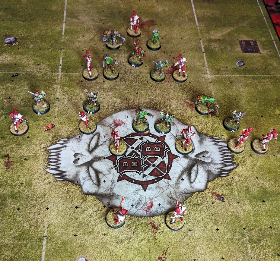 Most bash teams want to control the middle of the field. They know they do not have the movement or Agility to cover the breadth of the field, and they want to keep our defense as honest as possible before they make their move. When we set up asymmetrically we are presenting them with a challenge: Will you change your plan so that you can still block us? Are you prepared to risk a position where a failed pickup or a Blitz kickoff result will give us a huge scoring opportunity?