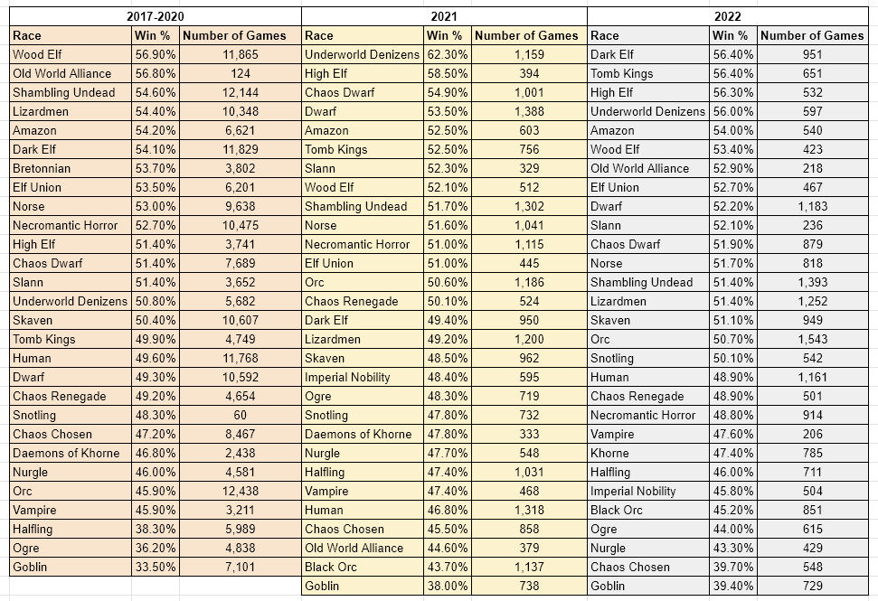 The teams below them start to see a mix of Tier 1 teams who were reined in by their Tier, and Tier 2 teams who found success with their additional help. Lower down the list we see some very competitive teams who have very middle of the road win rates (Dwarves, Skaven).