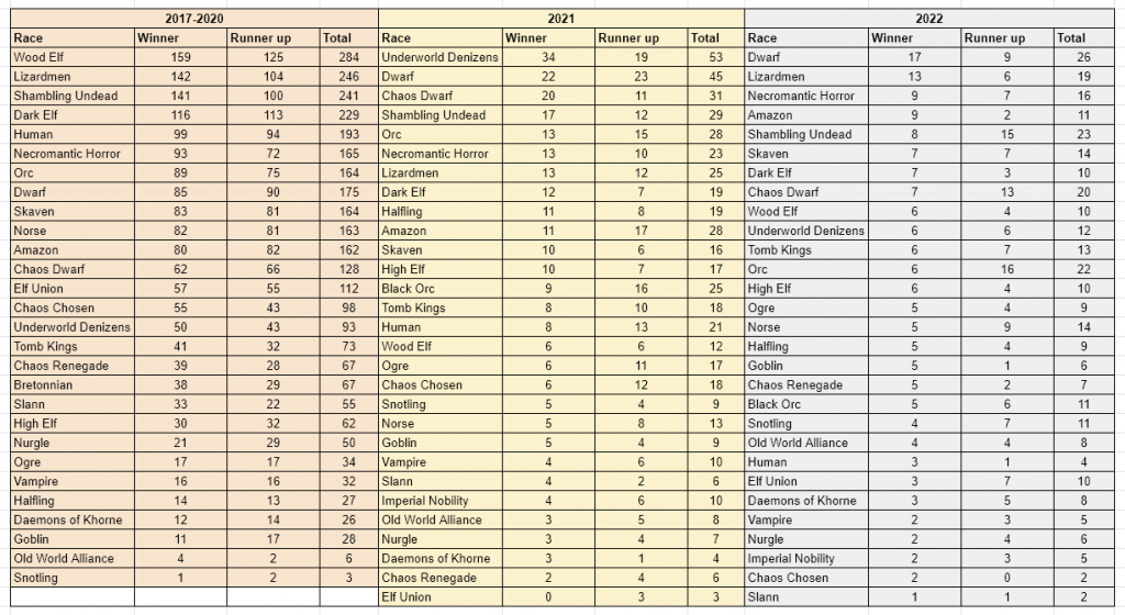 Half a year into 2022, and over a year and a half since the release of the latest Blood Bowl ruleset... and we have now seen thousands of games in the new era of competitive Tournament Blood Bowl. A scene which had been relatively stable for many years has been well and truly shaken up, and in this feature we’re going to take a look at the stats from this period and discuss some of the trends and stories that have emerged.