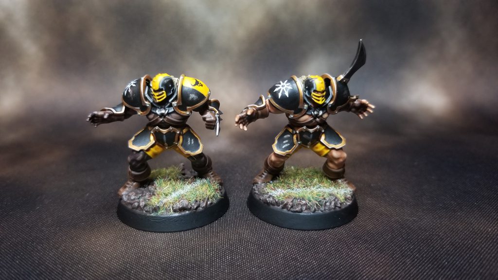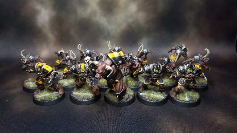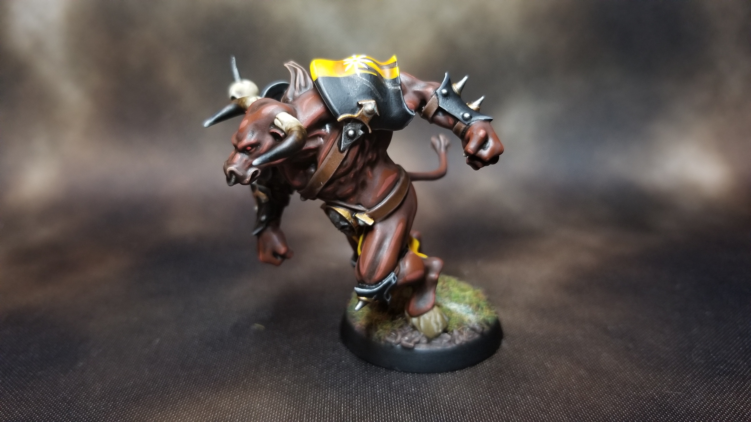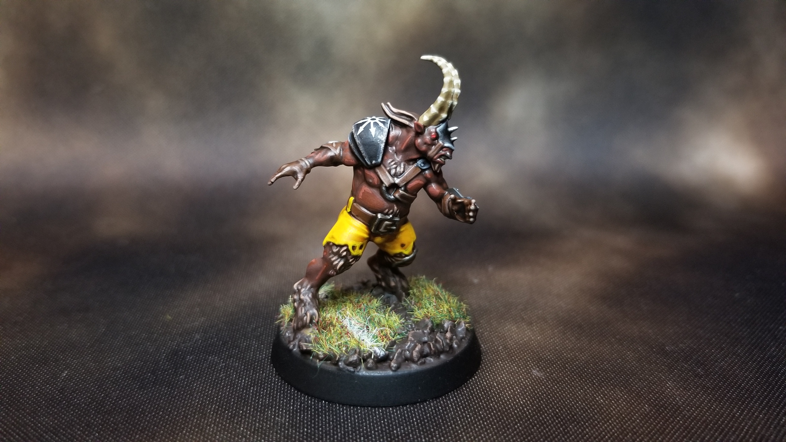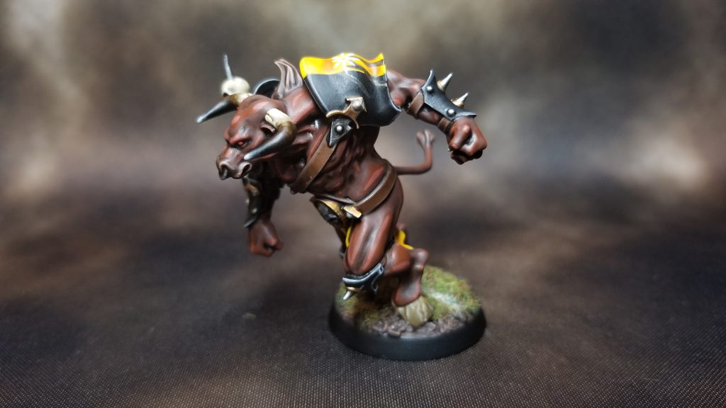 Anyways, I knew that for whatever team I’d choose to give him, they’d be painted black and yellow. I’ve already outlined how I paint black in the How to Paint Everything: Raven Guard, and I’m sure you can find other places to learn how to paint skin, leather, and metal, so I’ll instead focus on my yellow and the Beastmen skin and fur. I once again use Citadel paints and regular-ass brushes.
