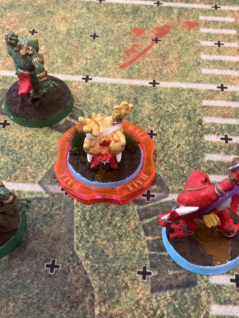 I don’t remember why I thought this picture was so important, but I took it twice, so here’s a frog’s butt for youBoth of the kickoff events in the first half were Time Out, so even though I scored in 2 turns, Gabriel ended up only having four turns to try and even it up before halftime. He must have been feeling the time pressure, because he tried to use Leap to get his entire team over my defensive line, starting with the ball carrier. The ball made it, but the second or third lineman he was planning to cage with failed the roll, which left the ball very exposed in my backfield. I sacked it and recovered, but Diving Tackle stopped me from running off and scoring. 1-0 at halftime with effectively no damage to either side - a pretty finely balanced game, really!
