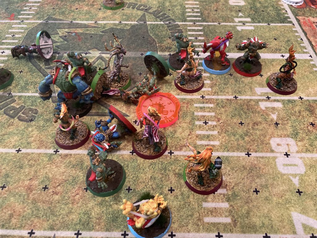 EXCEPT! Luke’s Runt Punter, upgraded with Leader (an extra team reroll, as long as that player is on the pitch) and Stand Firm was only two squares away from the sideline. My Frenzy/Juggernaut Wardancer was the perfect piece to push the ogre into the crowd, and I dropped all pretense of going after the ball to prioritize the Leader. Luke had only brought one rostered team reroll, with the Leader giving him a second, and Ogres are a reroll-hungry team.