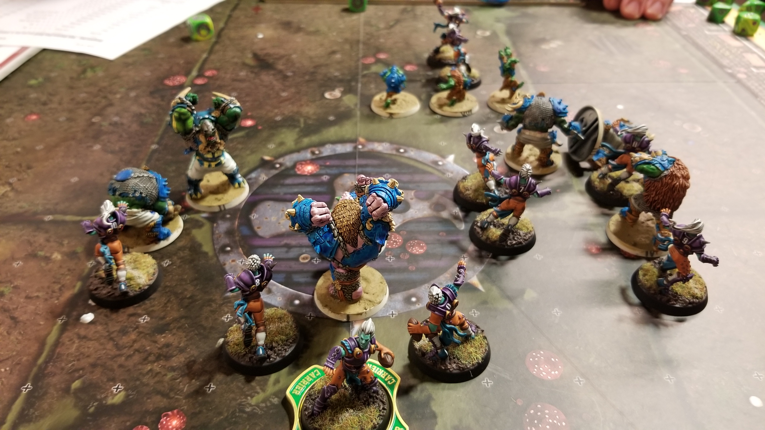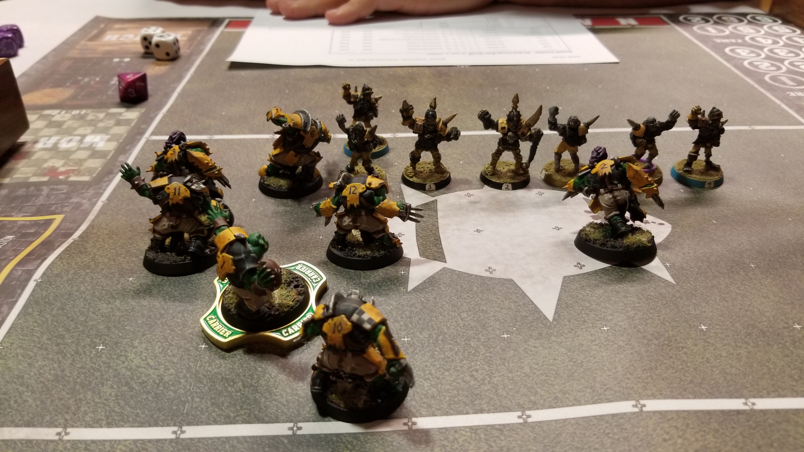 This was one of the most rewarding and intense games of Blood Bowl I’ve ever played, right up there with game 3 of the ACCC in July. Sean was obviously frustrated with his “good” rolling at the end there, but he’s a good sport anyways. I run off to get some lunch and decompress a bit after the intense match, with an eye to return before round 2 starts. However, I get back about 15 minutes early, and most people are already playing their games. The TOs had posted matchups early and people had already sat down to play. Unfortunately, the players who were at the table I just vacated kinda scattered my stuff around so I had to run around and gather everything up while my game 2 opponent waited for me. Honestly, it was a bit frustrating. Because of that, I didn’t get a picture of my game 2 opponent’s roster and I started the game a little bit flustered. I’ll recreate his list as best as I can, but I might not get it 100% right.