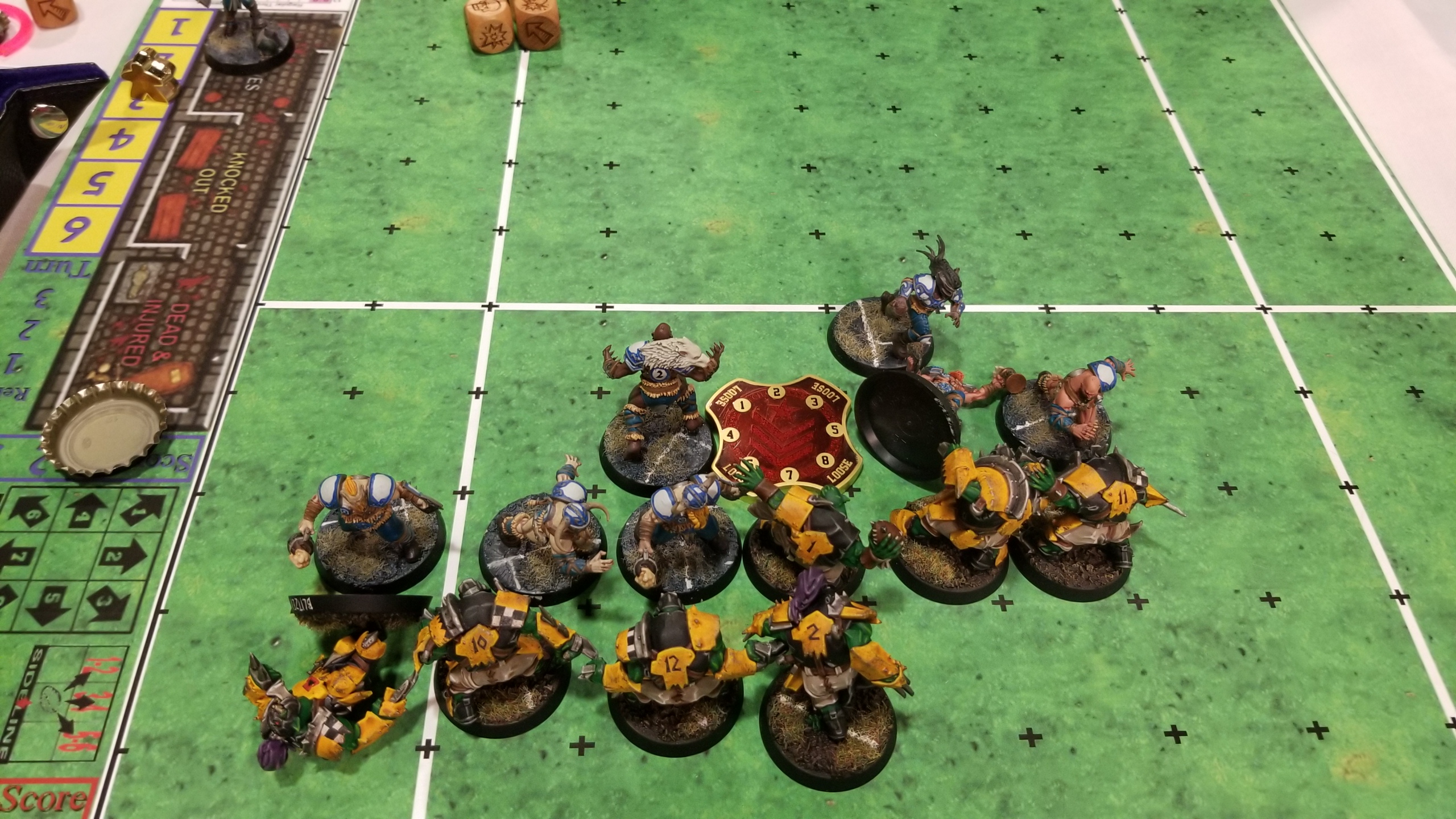 Cool scoreboard.Sean’s getting the ball in the 2nd half, and he immediately gets over the first hurdle: picking up the ball. No easy defensive stand for me this time. I set up the column defense and send a Blitzer into his backfield as he begins his grind down the field. Things go pretty well for a turn or two, but then he starts breaking my team’s armor. I’m hemorrhaging players. On his turn 12, he’s in range to score but decides to stall to give me no time to get back on top. Remember, my team is built for the quick score, so if he gives me two turns with possession of the ball, I’ll be in a good place to score the go-ahead TD. Turn 13 and turn 14 go by, and I realize that he’s going to try and go until his turn 16 to score to give me no chance to answer. At this point I advise him that he should go ahead and score, since it’s not guaranteed at all that I’ll be able to pull off another 2-turn TD. Additionally, I still have two blodge-stepping Blitzers mucking around. He declines to do so, so it’s up to me to have my Blitzers live up to their reputation as the most annoying players in Blood Bowl.