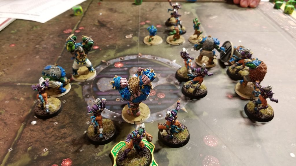 Trolls are big.Due to showing up “late”, I didn’t take detailed notes for this game. Joe’s an excellent player with a somewhat off-meta team, so I really didn’t know what to expect. I’m receiving the kick in the 1st half and I, once again, opt to score quickly before I lose all of my players. For the rest of the first half, he took the ball and marched it down the field, which is fine if I can stop him before he gets it in the end zone. And honestly, I thought I had him, there. However, I forget about Sprint on his ball carrier, and I stop him at what I think is out of range for an equalizing TD. Well, dear reader, I was wrong, and after two 3+ dodge rolls and 3 2+ rushes (with no re-rolls!), Joe’s got a speedy goblin celebrating in the end zone. We’re going into the half tied up.