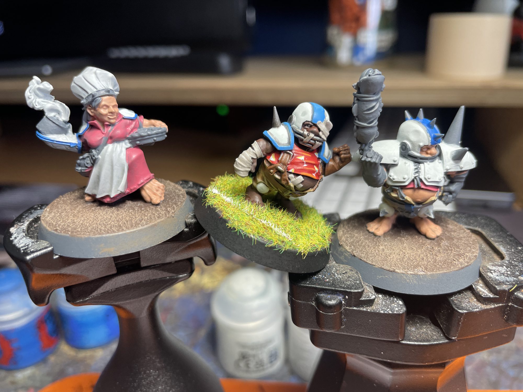 Cindy Piewhistle and Puggy Baconbreath with a Margaritaville Mangler. Credit: SRMI painted a Halfling team at the start of 2021, The Margaritaville Manglers. I foolishly didn't record how I painted them, but with a scheme that was somewhat loosey-goosey, getting close enough wasn't going to be hard. The details on these models are large and cartoonish, which makes picking them out especially easy. They also lend themselves to bright, saturated colors, which I went for with mine. I knocked them out over a few leisurely afternoons and evenings, and found them to be an enjoyable experience.