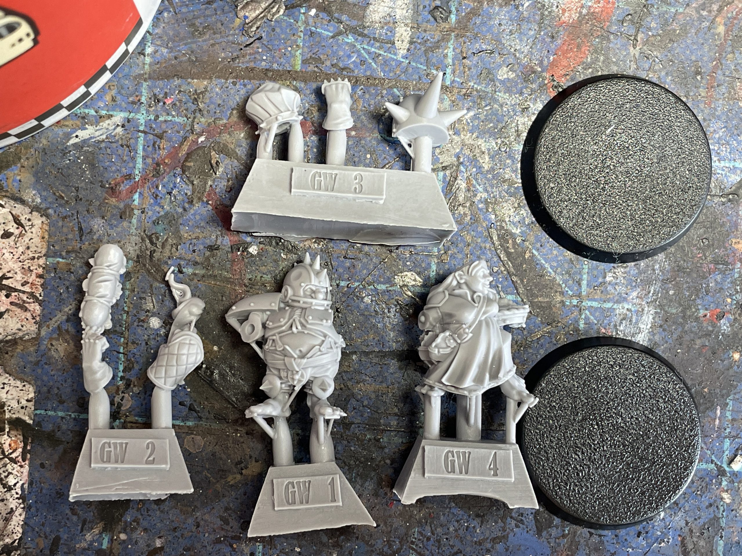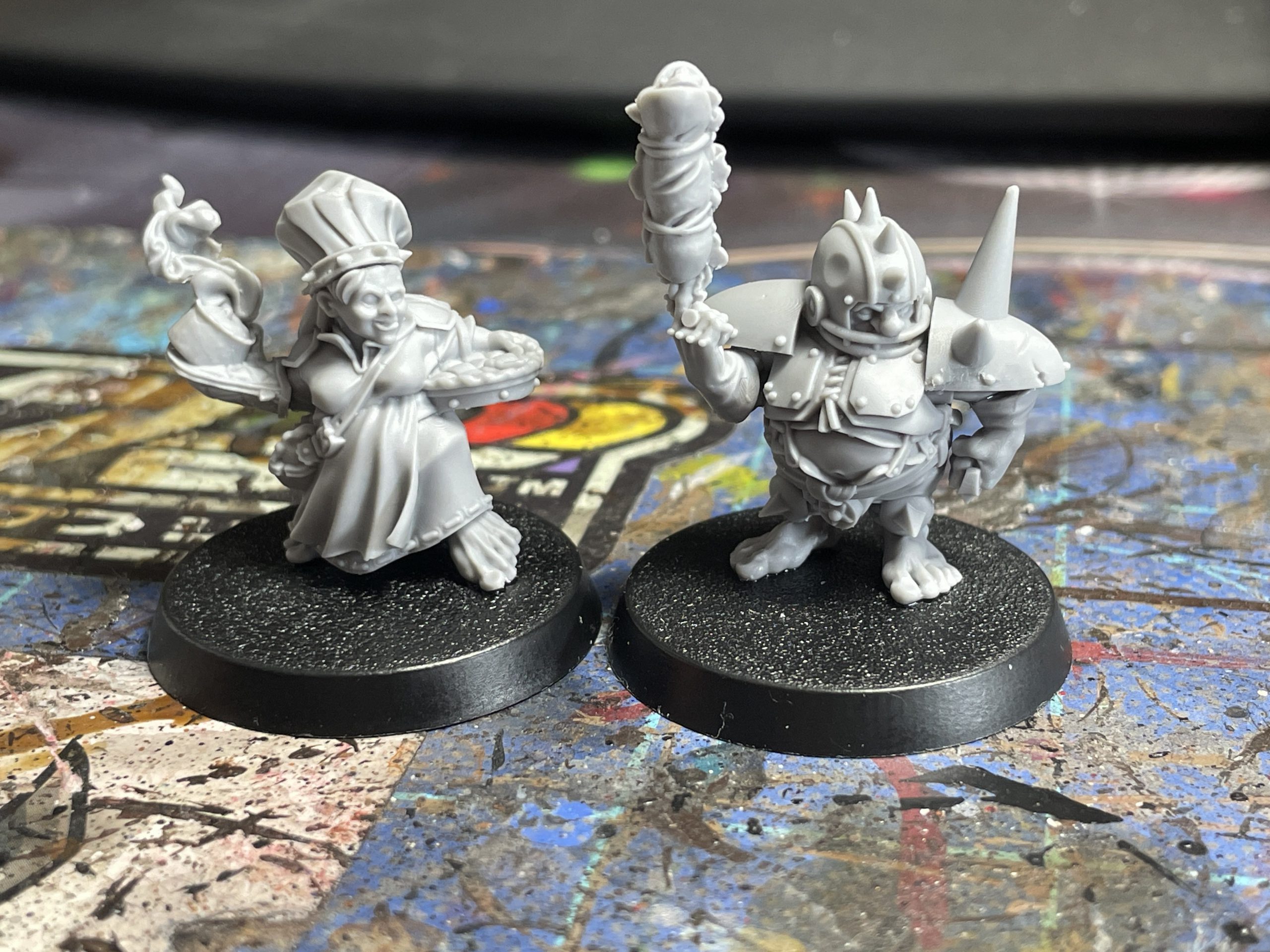 Puggy Baconbreath and Cindy Piewhistle WIP. Credit: SRMThese casts are clean. I'm talking Modiphius levels of clean. I had no miscasts, and only a wee bit of mold slippage on Puggy's shoulderpad, which left a seam that was easily shaved down. There were a few resin gates that took some deft knifework, especially on their toes and the steam from Cindy's pie. I will not post closeup toe pics because none of y'all pay enough on Patreon for that privilege.