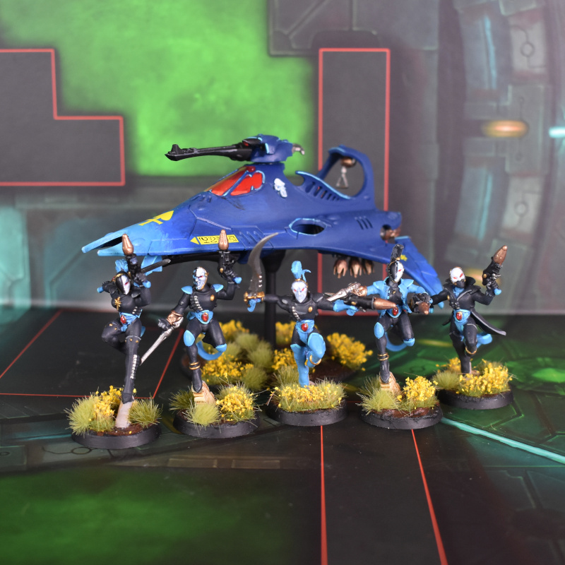 Troupe Master [4 PL, -1CP, 85pts]: 3: A Foot in the Future, Harlequin's Kiss, Player of the Light, Shuriken Pistol, Stratagem: Favoured of the Laughing God, Warlord . Cegorach's Rose