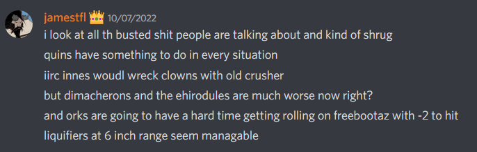 Which brings us to our final list of the bunch. Harlequins have also been the subject of multiple nerfs in a short span, seeing both a mix of large point increases and serious adjustments to some truly bullshit mechanics, such as the Death Jester's ability to proc extra shots and the number of fate dice they generate. Whatever you thought of Drukhari in their hayday, Harlequins are arguably worse and able to do it better.If there's a ringer in this event, it's potentially Erik Nelson, a longtime Elves player who has yet to win a tournament but is probably the best overall player of the casual group. As such, we've handicapped him a bit by making him build his own list and play it without outside help, though given how insanely strong Harlequins are, he probably won't need it anyways.
