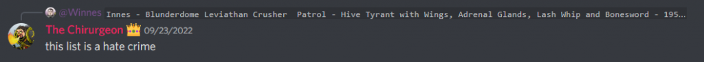 Of course we're not going to put up with that bullshit in our casual BLUNDERDOME! Our own Innes Wilson paid good money for his copies of Octarius and White Dwarf, and he's going to use them. You may remember Innes as the eventual "winner" of the first Blunderdome, in which his spore mine list proved to be truly incapable of winning a game. He's back now and ready to introduce the world to Godfucker, a truly hateful Hive Fleet Leviathan Hive Tyrant capable of dealing 40+ mortal wounds in any given turn.