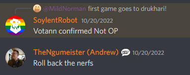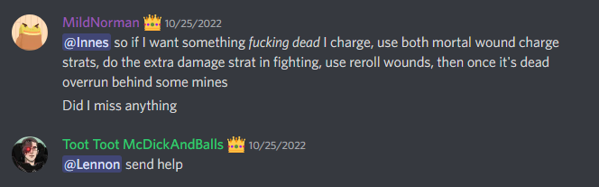 And that's round one in the books! With 3 out of 4 games ending in 100 point wins for one side I think we’re starting to see a trend with the lethality of these books. I’m sure it's fine though, we’re playing just like games workshop intended, and our casual players are having a great time free of the tyranny of constant “FAQs” and “balance passes”. Everyone’s having fun. Don’t ask.Have any questions or feedback? Drop us a note in the comments below or email us at contact@goonhammer.com.