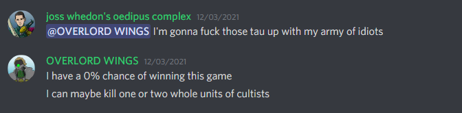 The Cultists got completely bodied by Daemons last round while the T'au managed a surprise victory over the Astra Militarum's Vanquishers and their reward is getting paired into each other. The Drones have almost no meaningful way to kill the Cultists, at least not in the numbers winning would require, and while the Cultists will struggle against T4 drones, they have the sheer numbers to pull off a grinding win here. The Cultists are bad at shooting and bad at fighting but they're better at both than the drones plus they have more bodies and obsec. The most fun either player will have in this game is watching Liam try to fit his army in the deployment zone for the Scouring.