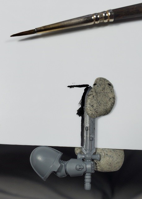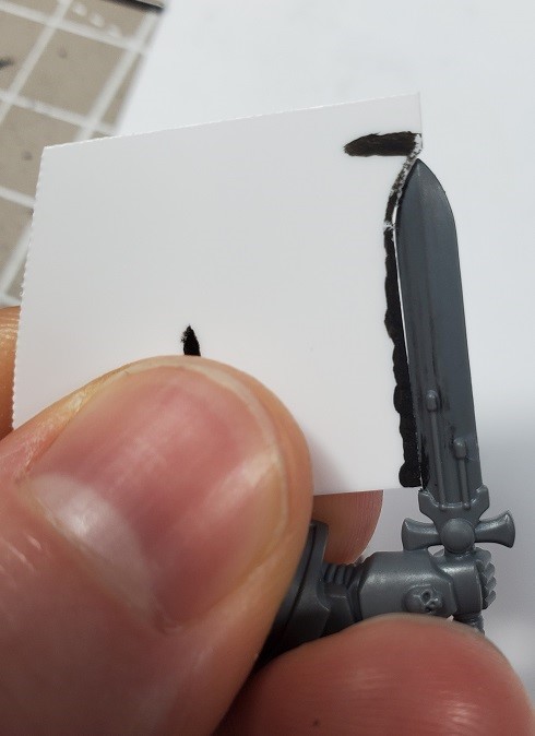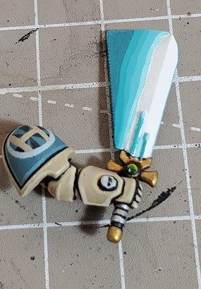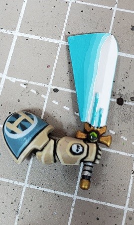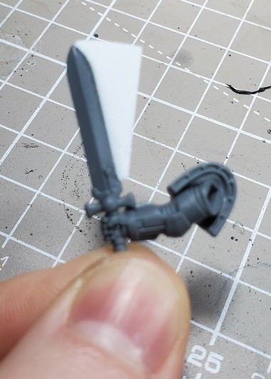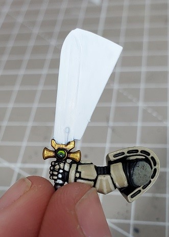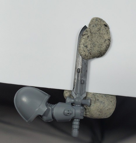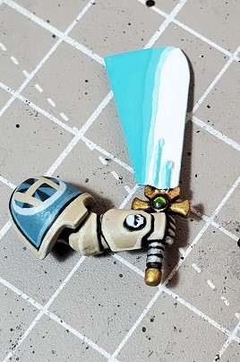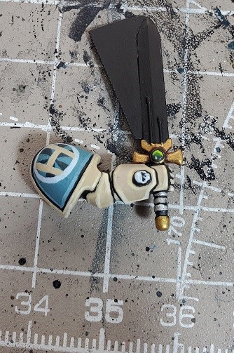 Step 6. Prime the sword blade if you haven’t. In this case I didn’t while I was working on the marine. I didn’t have a good location to secure the arm to a pin while working on it.