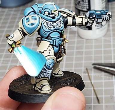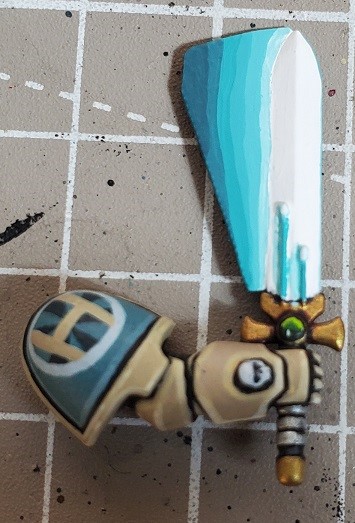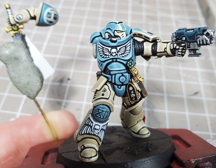 Step 7. Draw a couple circles, a couple connecting lines, and finish the space marine holding the sword. If for some reason you’d like a more tedious tutorial you can find it at: https://www.tabletopbattles.com/painting-them-tan-and-blue-boys-blacklined-power-armor/