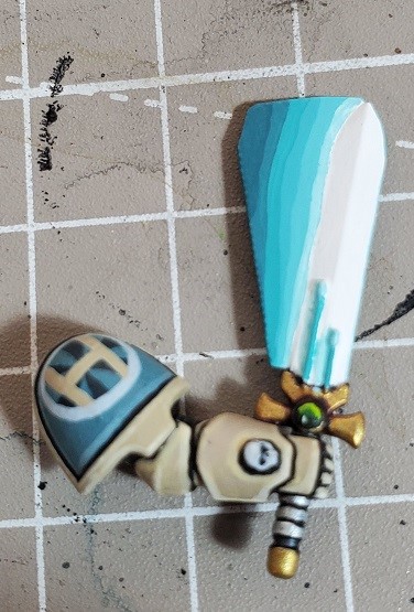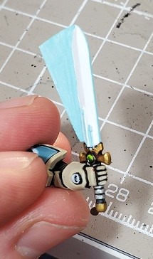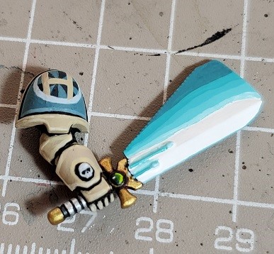 Initial color. You want to hit the leading edge of the sword (as it’s in motion it would not have as much light as the body), any raised detail, the trailing edge behind that detail, and the entirety of the plasticard. Use common sense, You’re basically reversing the effect behind any raised surfaces that don’t give light. On the plastic card the light will grow dimmer as it flows away from the sword, but behind raised texture it will grow brighter.