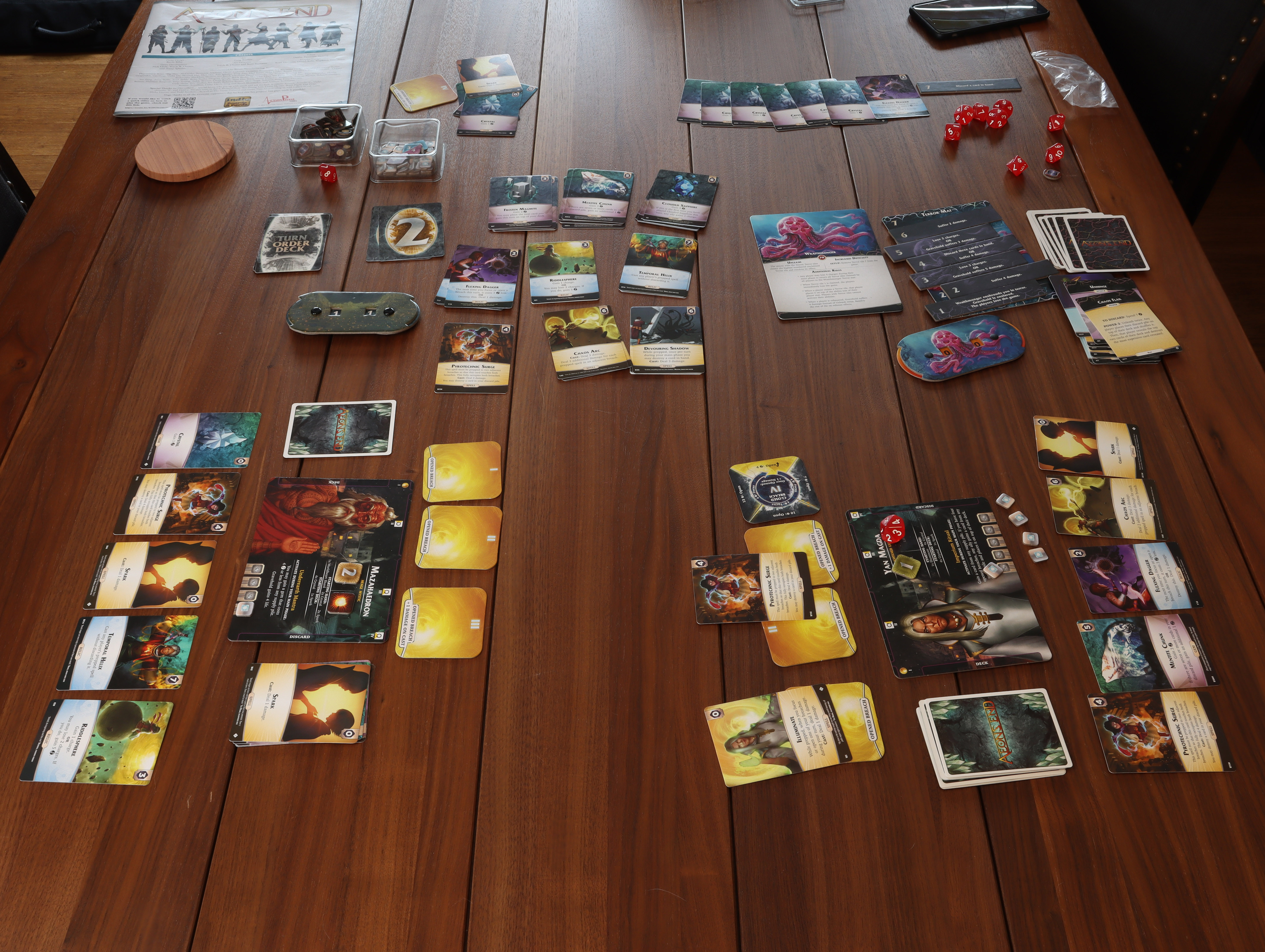 Humanity prevails! The cards are messy, the lighting is off, but after several hours of fantastic gameplay, this is the very moment of triumphVictory! - Wraithmonger was reduced to 0 HP. Some powerful combinations of cards presented themselves, and the players took every advantage they could. Despite that, the missing fourth breach and lack of HP indicator shows that Mazahaedron was exhausted (reduced to 0 HP), which means it was no easy fight.