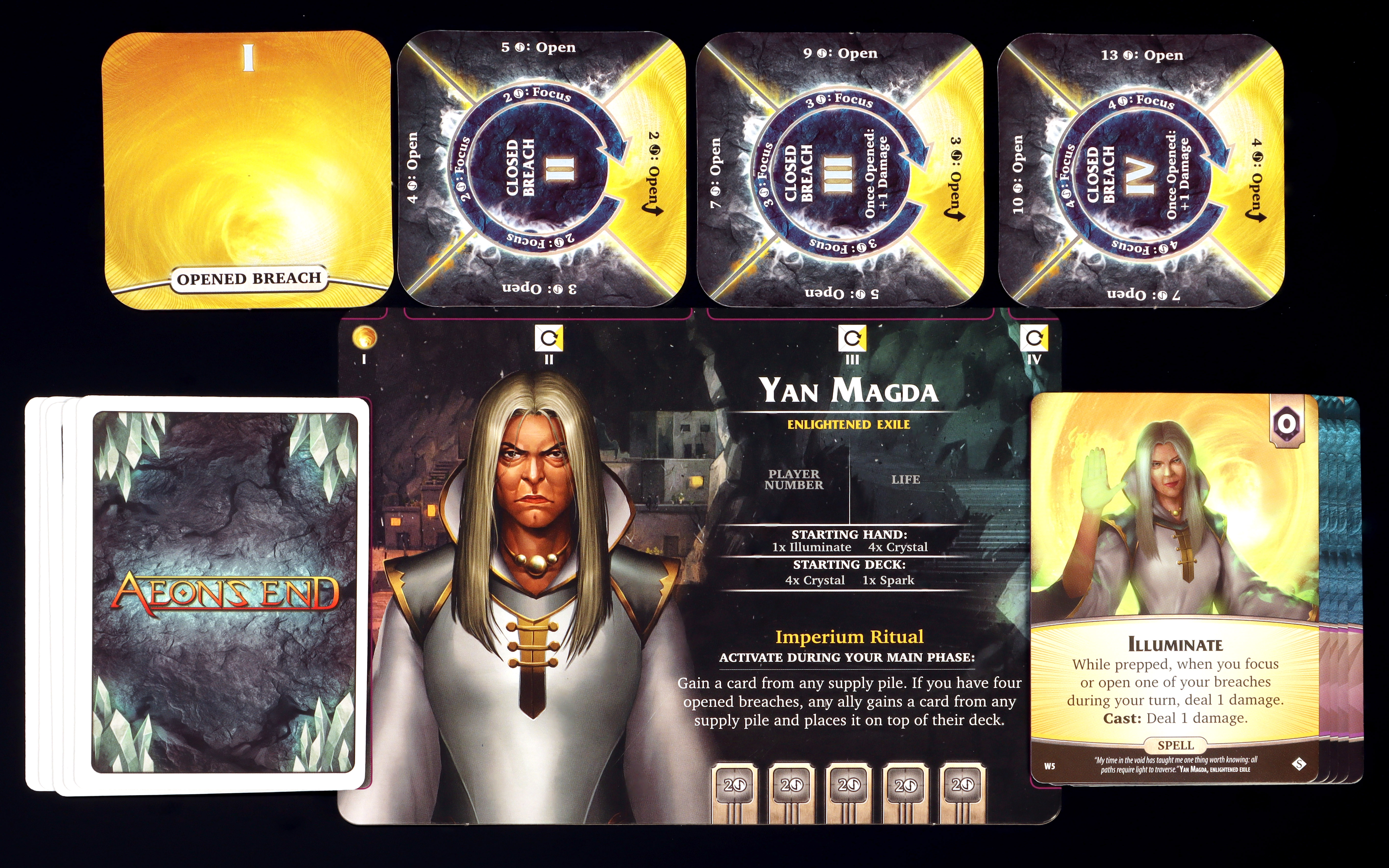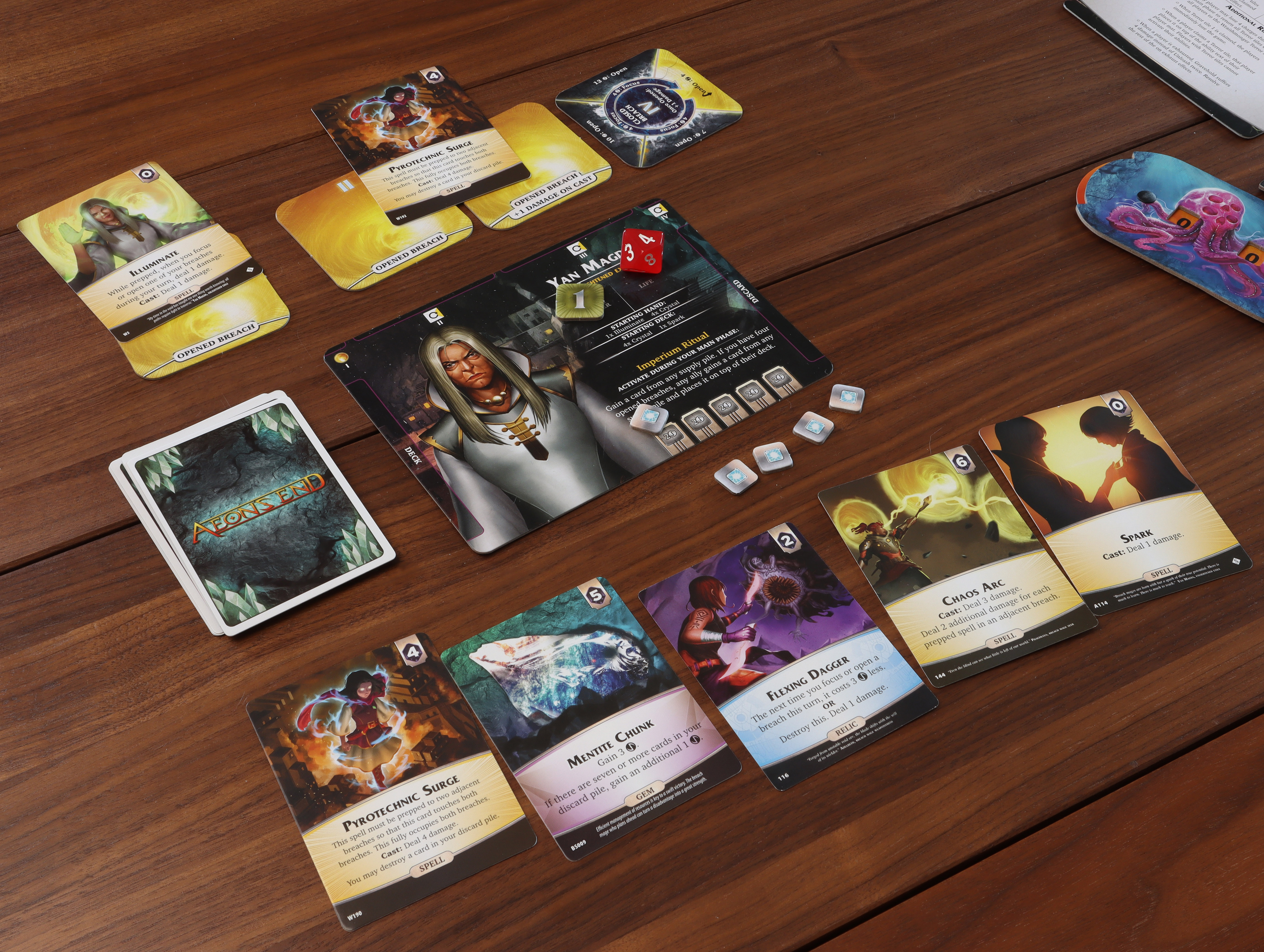 Mazahaedron can purchase cards for other players. What a cool guyThis is our first time looking at the player's tableau. You see the breach mage card, complete with their ability, starting hand and deck, as well as their four breaches represented by the four tiles at the top. Each of those tiles may be used to cast spells, but only when they are opened or focused. Opened breaches, like the left-most, remain opened throughout the game and players can continuous prepare and cast spells from those breaches. Closed breaches can be opened, but doing so costs quite a bit of aether. Sometimes a better strategy is to focus a breach, which rotates the tile clockwise. Focusing a breach makes it cheaper to open on a future turn and lets players cast a single spell from that breach the turn it was focused. Most breach mages start with a single opened breach, but each mage's configuration of breaches is different making some especially strong spellcasters by virtue of their breaches being cheaper to open.