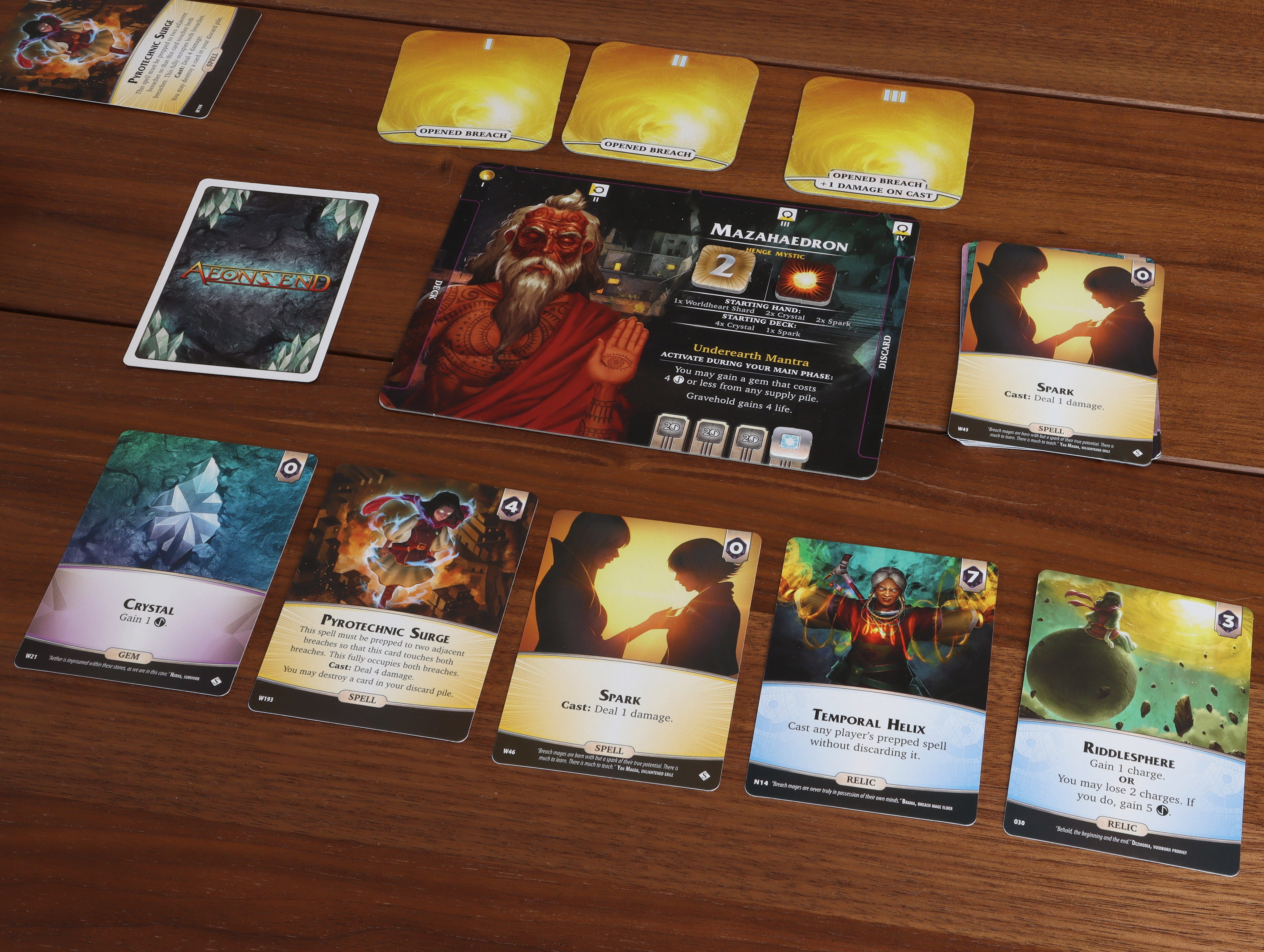 The start of a battle that determines the fate of humanityIn this match, the breach mages Mazahaedron and Yan Magda face off against the Wraithmonger. Before we dig in, you might wonder why these hands of cards are shown face-up. This is because Aeon's End doesn't have any hidden information between players. Show that hand of cards off and work out strategies together!