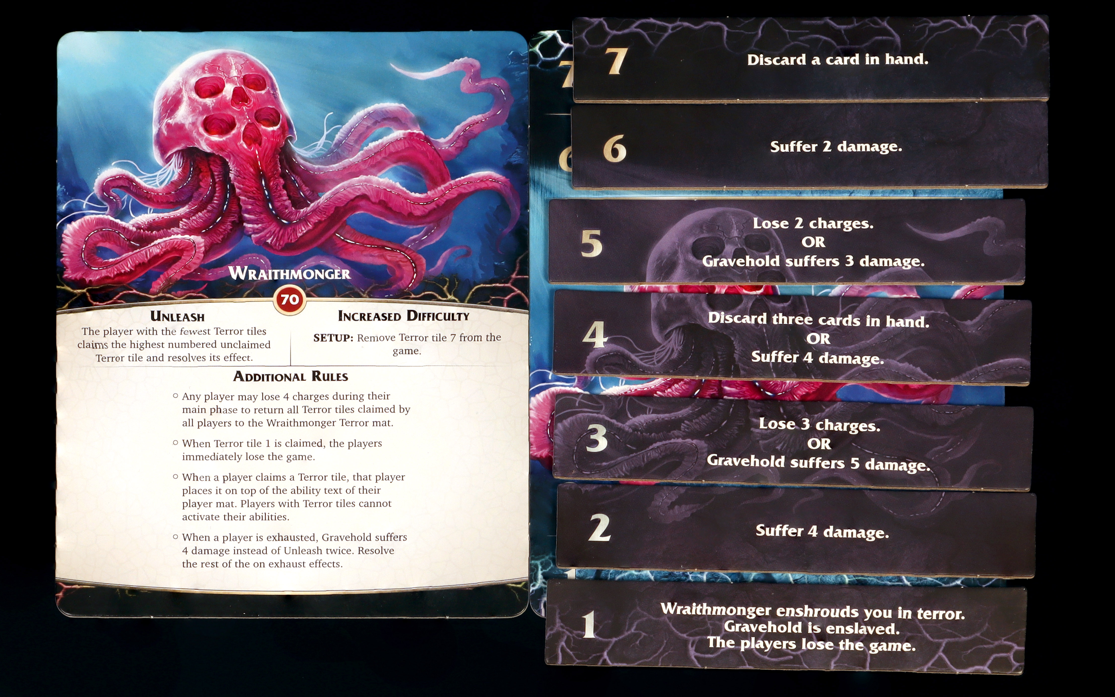Wraithmonger not only has 70HP to burn through, but he also has that punishing "The players lose the game" ability on Terror tile 1Right off the bat, Wraithmonger shows up with a staggering 70HP, which is a lot to burn through. Additionally, it has a unique Terror mechanic, where it places Terror tiles on top of your character sheet. Having one of these tiles prevents you from using your breach mage's unique abilities, and if not dealt with, eventually will cost you the game. In addition to Wraithmonger's horrifying terror track, it comes with nine unique cards which are shuffled into it's deck of cards. These cards range from "mild inconvenience" to "stand up and pace for a couple minutes to formulate a plan" levels of danger.