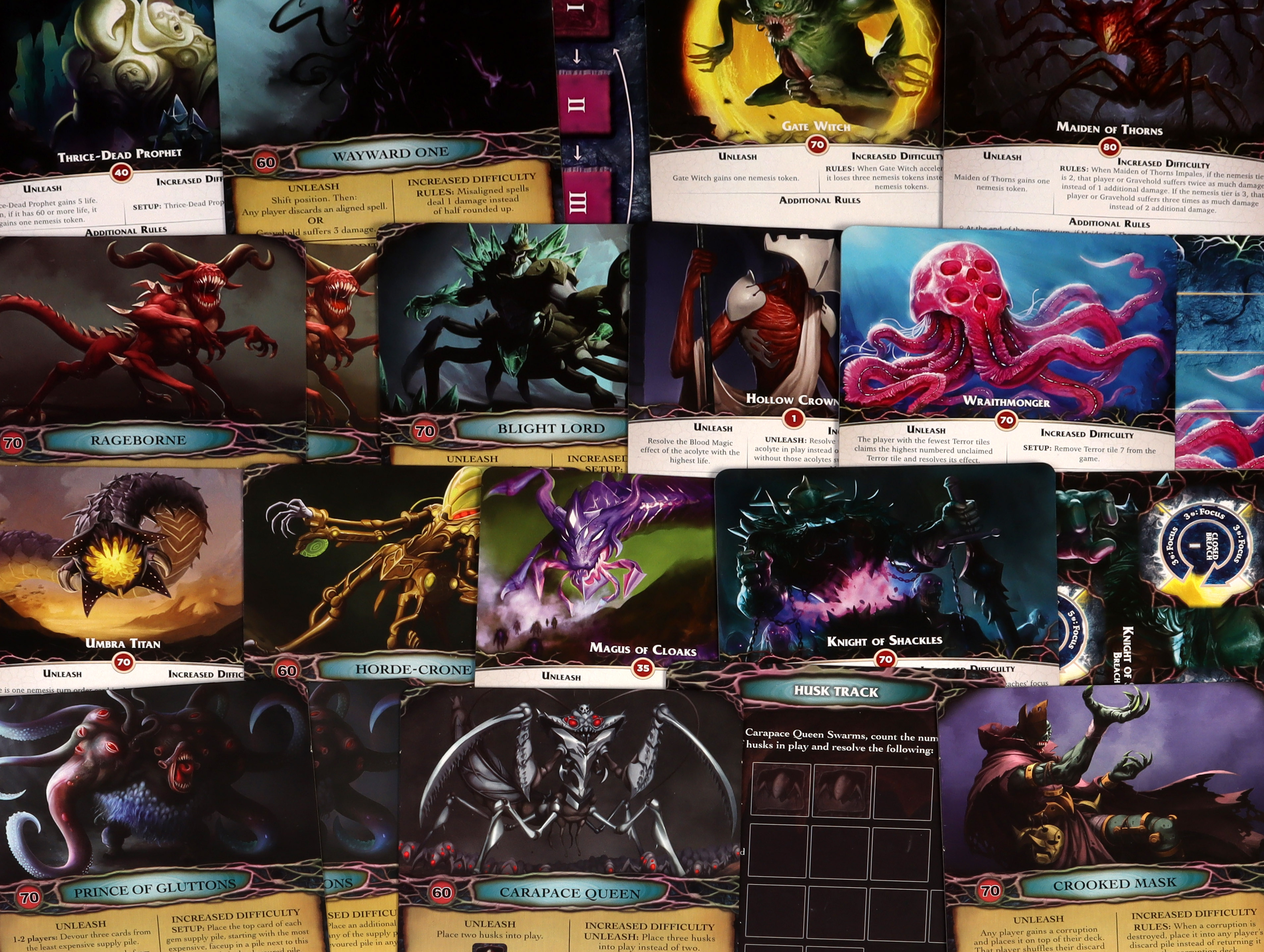 Each of these Nemesis has their own unique mechanics, cards, and threatsIn each game, you are pitted against a single Nemesis, the proverbial big-bad-evil-guy. Like the players, the nemesis gets a turn of their own to wreak havoc. On their turn, they'll summon creatures, attack players or Gravehold itself, or begin channeling powers that may not come to bear for multiple turns. Which Nemesis you fight completely changes the game, where in one game you might face a never-ending swarm of creatures, and in another you might find your own spells working against you. Each Nemesis is different and has their own entirely custom mechanics, cards, and strategies.