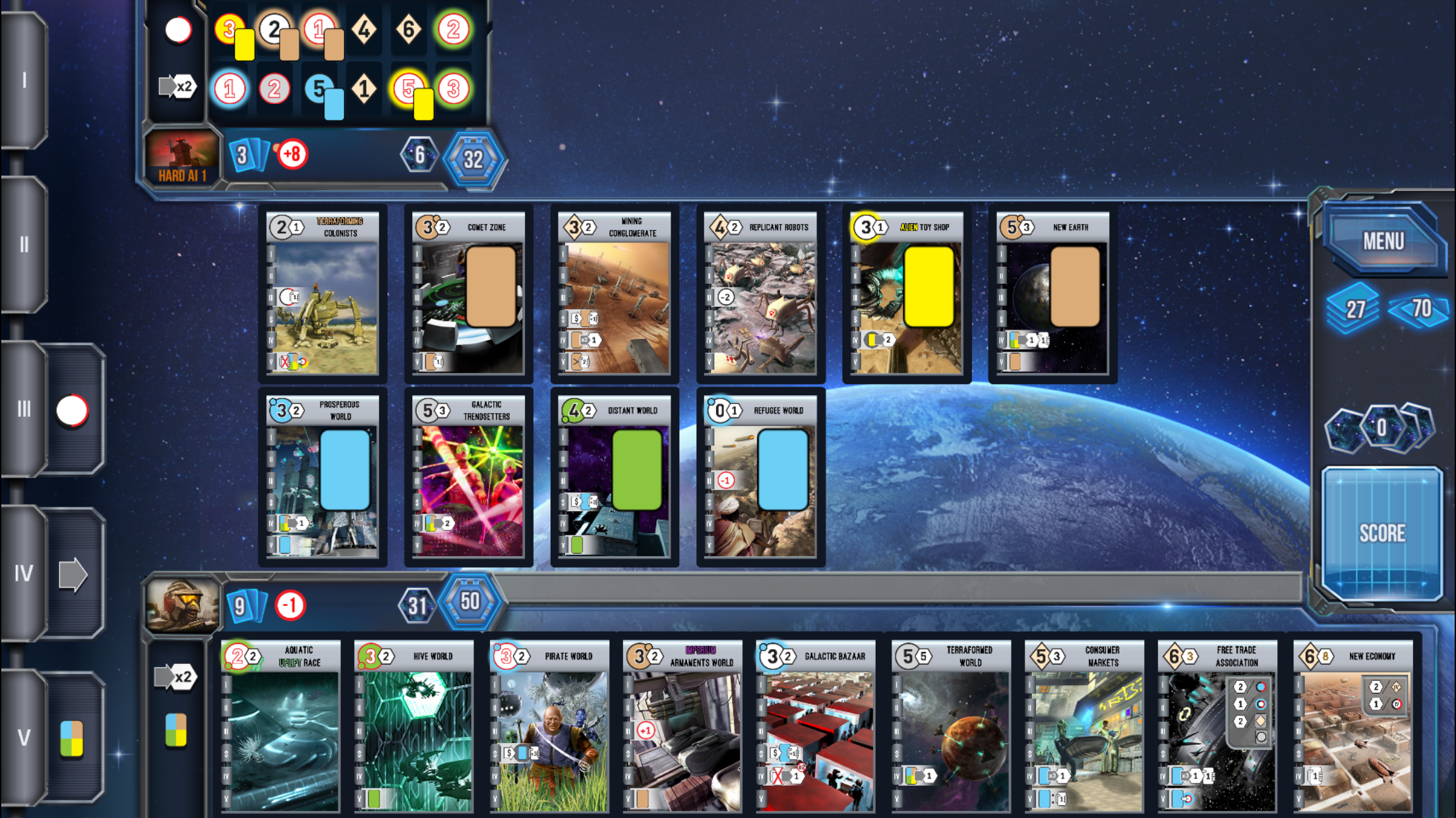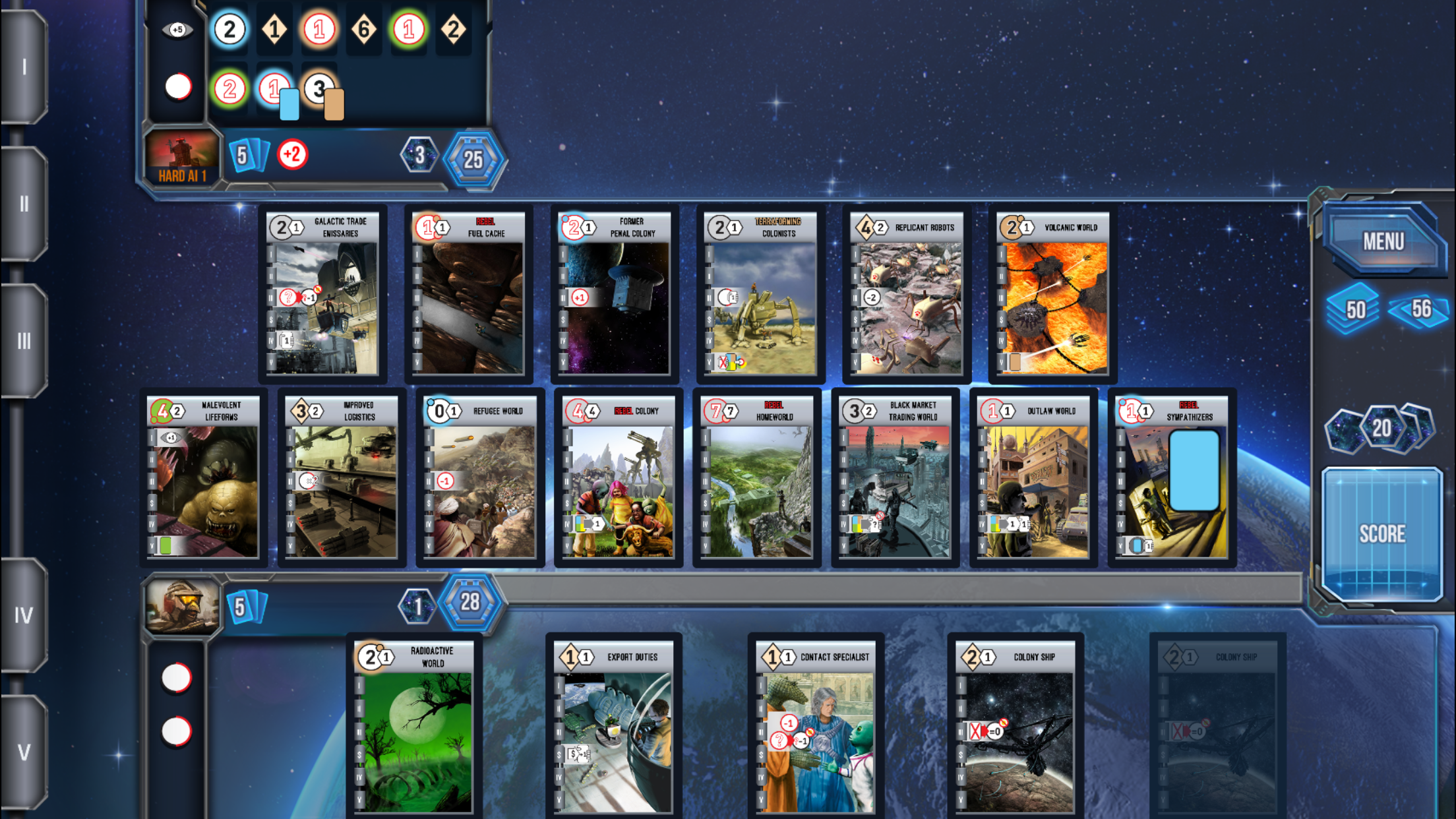 Worth 10 victory points (the numbers in the hexagon on the top left), and a beast at production.Developments, on the other hand, largely act as modifiers and are represented by cards with diamonds in the top left corner. Developments frequently bolster and reward the worlds you have colonized and enable interesting and powerful combinations. Worlds and developments both earn you victory points (though some worlds have powerful enough mechanics that they hilariously award you negative victory points). Worlds always award a fixed amount of victory points, but developments are different. While most developments are worth a fixed amount of victory points, the interesting game-changing developments are different. Developments that have a cost of six (the number inside the diamond, we'll touch on "cost" later), award victory points that scale off other cards in your tableau.
