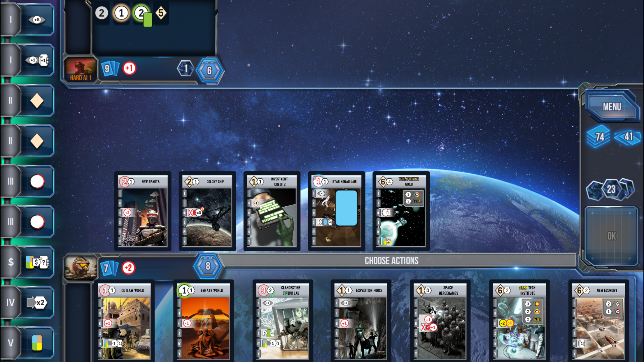 I'm leading 8 victory points to 6. I've got a strong start for military and Investment Credits make all my developments cost one fewer. A good start!Phase 1: Explore