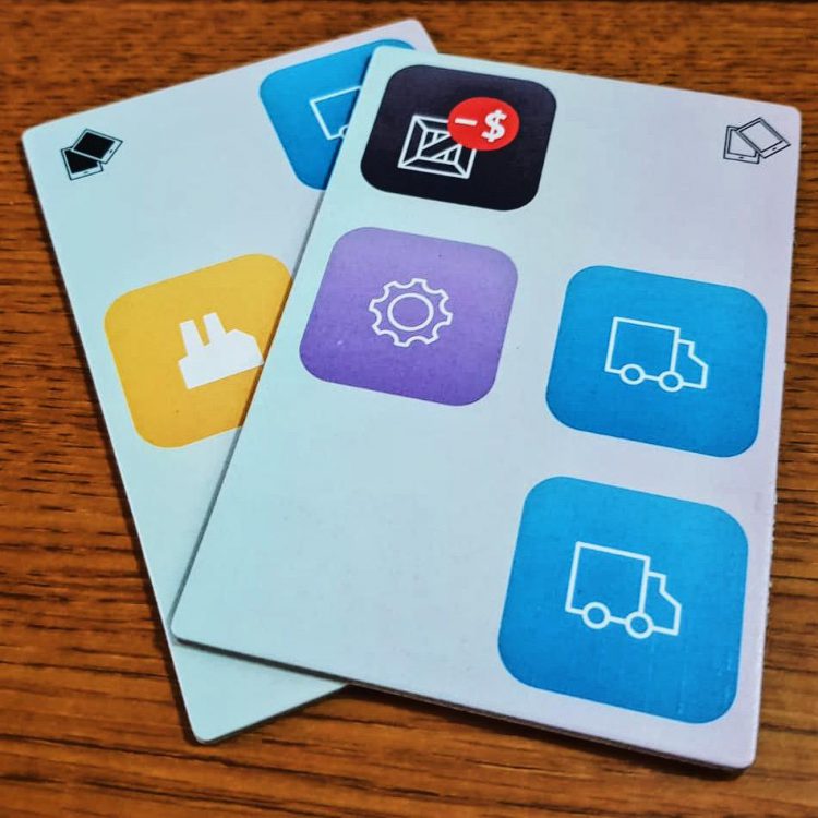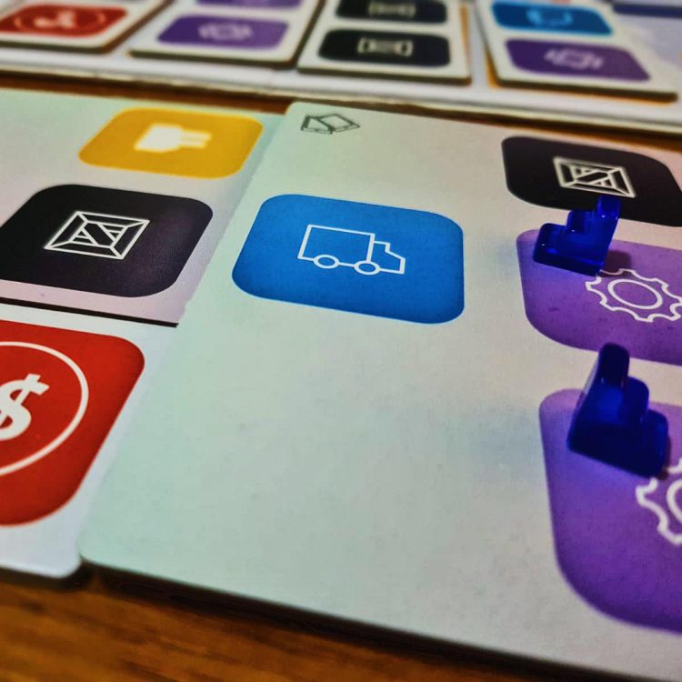 Cosmodrome Games did the right thing and used Kickstarter to fund the development tweaks and components upgrades of this game, and you can see it shines. High quality graphics, materials, game-board, cards, pieces, screens. They did the game right by going that road. Artwork is clean and easy to distinguish from each other, which is important as the game is icon heavy. And I do mean very icon heavy. That being said, the icons are pretty clear what they represent (money symbol for price, truck for logistics, gears for technology, etc), but it will take a few games to get them all down without having to stop and think what it represents.