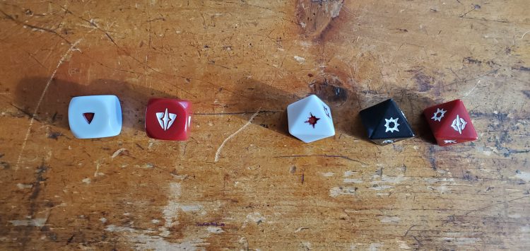 The game uses proprietary dice which I'm a little iffy on. The core set really doesn't give you enough to be able to roll your corps shots in one go, so you'll probably need to buy more if you go further in the game. Which die you used is based on the weapon or defense value listed on the unit card, with d6s used for saving throws and d8s for attacking. White dice = Terrible, Black dice = Mediocre, Red dice = Great. Blanks mean nothing happens, solid symbols mean a success, empty symbols mean a crit (attack that cant be dodged) and a symbol with a line through it is a surge, which might mean a crit or nothing (depending on the card as explained in "Anatomy of a Card").