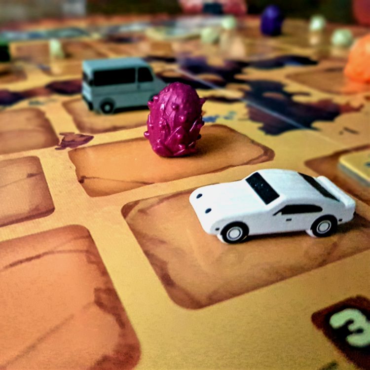 Let us talk game play. On each players turn, they will have 3 actions that they can take. The first action is playing a vehicle card from their hand onto a worm in the terror zone. This is followed by the sub actions, which is resolving the card just played. There are up to three different sub-actions that will happen, based on the card played as the first action.