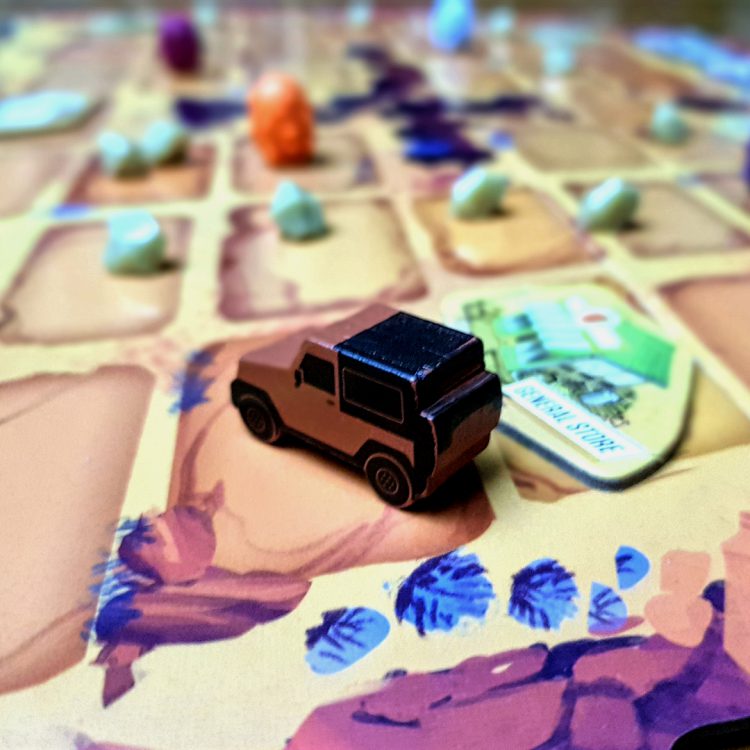 How can I say this, this is Renegade Games quality at its best. Super heavy-duty cardboard parts, solid card stock for the cards, clear artwork and light iconography on the game (just enough to distinguish what they are in case the colors of the cards are causing issues. The one quibble I have is on the card sizes. You see, we have two different size cards provided in the game - a standard(ish) size card and mini-size cards. And the text on the mini cards can be hard to read, especially when there's lots of text on them. You see, there are some of the mini cards that are chock full of text (I'm looking at you, Worm Pheromones, Military Satellite, Lucky Hat, Worm Trap and others). And the font used on the cards could be a bit cleaner, making the cards easier to read. Artwork fits the theme, with that reddish 'Arizona/Mad Max' type of artwork and coloration being used on the board and cards.
