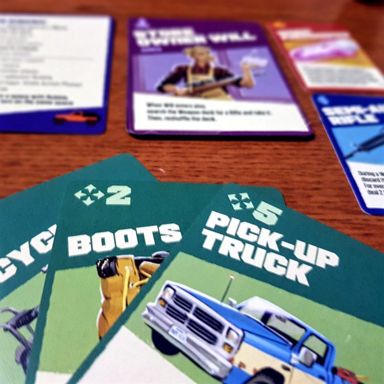 All this said and done, let us get the players set up to play the game. Each player will take 1 player token of their choice and the player aid card that matches the color of their vehicle. Each player then receives 1 item card, 1 weapon card, and 3 vehicle cards. You will want to keep the item and weapon card face down and hidden from the other players, while the 3 vehicles are the players starting hand. Finally, each player draws 3 characters from the pile, and selects one of them as their leader, which will be face up on the table in front of them. The remaining characters are placed face-down in any order underneath their leader card. Note that each player card has special abilities - some happen on every one of that players turn, some happen when they come into play.