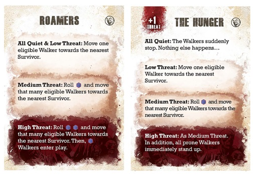 Next you draw the Event card. These will do a variety of things: move walkers toward survivors, add to the Threat level, or add more walkers to the board. You can see above it is based on each threat level that you're in so the game gets harder as it goes along, simulating more walkers drawn to the area as fighting gets worse.