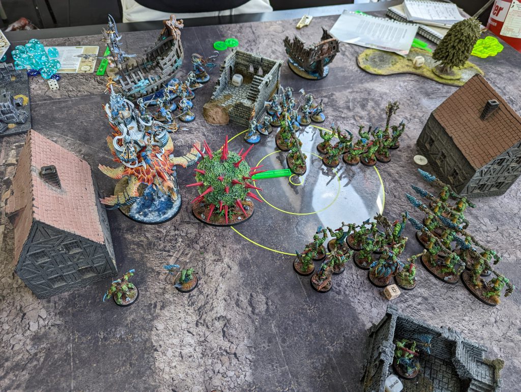 The big change I think I’d make would be spell selection. Glowy green tusks and Gorkamorka’s war cry are the ‘best’ spells in the Bonesplitterz lore, but I found I was almost never casting them. I had tusks on the Maniak, who was more often than not using his single cast on Purple Sun early, and by the time he’d be more able to buff the boars they were quite often very dead or depleted. Likewise I didn’t cast war cry once, both casts of it were on the Wurrgog prophets but the 12” range on the spell is the exact same range as on their Wurrgog mask ability which I elected to use every time rather than casting. Maybe this was a mistake in some situations, but it feels like anti-synergy on that model.