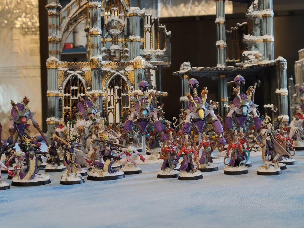 Running Thicc City, Cameron opted to add a third Talos unit and Drazhar rather than souping in Dark Technomancer Cronos and a Court of the Archon but otherwise we had very similar lists. The trade-off amounted to a little more flexibility (my Cronos and Court) vs leaning even harder into the extreme durability and combat potential (his additional Talos and Drazhar) – it was a well-matched game where Cameron may have had a slight edge in damage output due to the additional heat lances his three extra Talos carried – they were the most significant threat to our armies with their D2 + d6 damage. In the Thicc City mirror, the damage advantage is important if you’re not full-on infantry skew like Mani Cheema’s Wrack hate crime list.